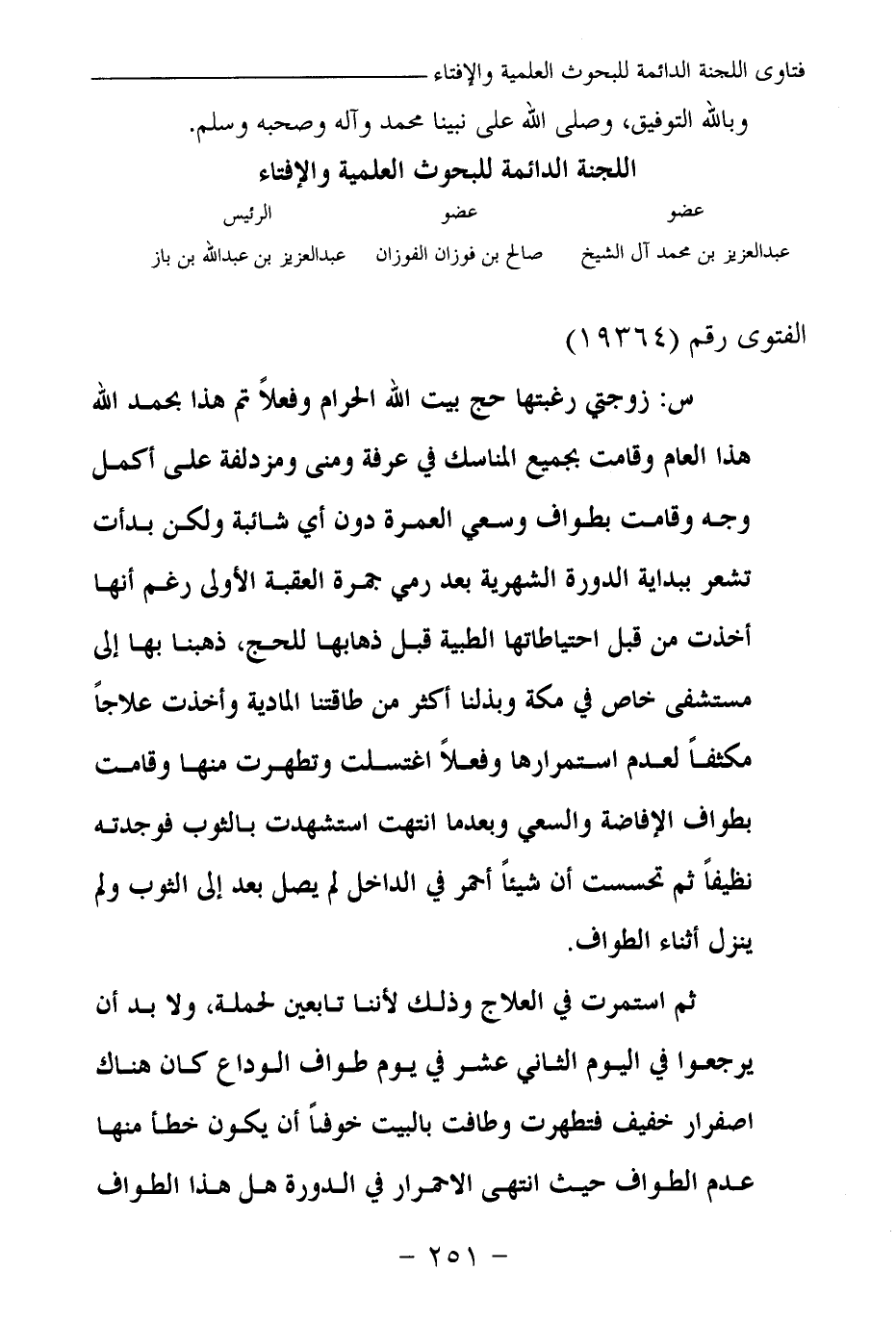 س: زوجتي رغبتها حج بيت الله الحرام وفعلا تم هذا بحمد الله هذا العام، وقامت بجميع المناسك في عرفة ومنى ومزدلفة على أكمل وجه، وقامت بطواف وسعي العمرة دون أي شائبة، ولكن بدأت تشعر ببداية الدورة الشهرية بعد رمي جمرة العقبة الأولى رغم أنها أخذت من قبل احتياطاتها الطبية قبل ذهابها للحج، ذهبنا بها إلى مستشفى خاص في مكة، وبذلنا أكثر من طاقتنا المادية وأخذت علاجا مكثفا؛ لعدم استمرارها وفعلا اغتسلت وتطهرت منها، وقامت بطواف الإفاضة والسعي، وبعد ما انتهت استشهدت بالثوب فوجدته نظيفا، ثم تحسست أن شيئا أحمر في الداخل لم يصل بعد إلى الثوب ولم ينزل أثناء الطواف.