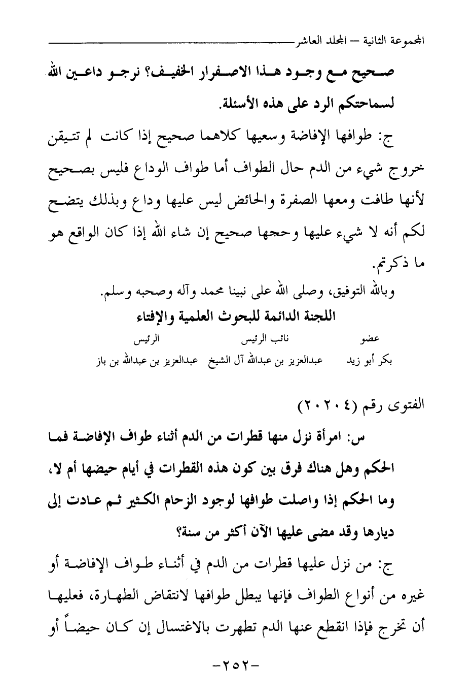 ج: طوافها الإفاضة وسعيها كلاهما صحيح إذا كانت لم تتيقن خروج شيء من الدم حال الطواف، أما طواف الوداع فليس بصحيح لأنها طافت ومعها الصفرة، والحائض ليس عليها وداع وبذلك يتضح لكم أنه لا شيء عليها، وحجها صحيح إن شاء الله، إذا كان الواقع هو ما ذكرتم.