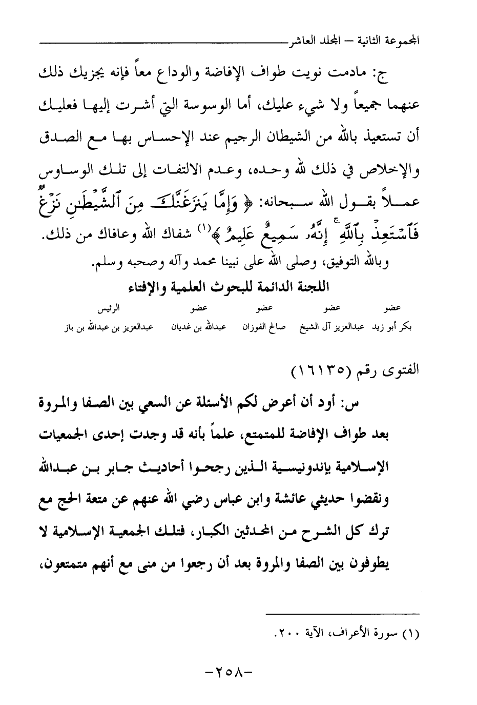 ج: ما دمت نويت طواف الإفاضة والوداع معا فإنه يجزيك ذلك عنهما جميعا ولا شيء عليك، أما الوسوسة التي أشرت إليها فعليك أن تستعيذ بالله من الشيطان الرجيم عند الإحساس بها مع الصدق والإخلاص في ذلك لله وحده، وعدم الالتفات إلى تلك الوساوس عملا بقول الله سبحانه: {وَإِمَّا يَنْزَغَنَّكَ مِنَ الشَّيْطَانِ نَزْغٌ فَاسْتَعِذْ بِاللَّهِ إِنَّهُ سَمِيعٌ عَلِيمٌ} (¬1) شفاك الله وعافاك من ذلك.