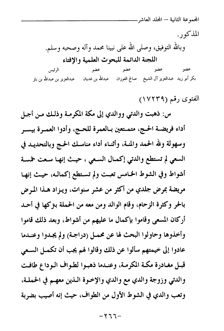 س: ذهبت والدتي ووالدي إلى مكة المكرمة وذلك من أجل أداء فريضة الحج، متمتعين بالعمرة للحج، وأدوا العمرة بيسر وسهولة ولله الحمد والمنة، وأثناء أداء مناسك الحج وبالتحديد في السعي لم تستطع والدتي إكمال السعي، حيث إنها سعت خمسة أشواط وفي الشوط الخامس تعبت ولم تستطع إكماله، حيث إنها مريضة بمرض جلدي من أكثر من عشر سنوات، ويزاد هذا المرض بالحر وكثرة الزحام، وقام الوالد ومن معه من الحملة بتركها في أحد أركان المسعى، وقاموا بإكمال ما عليهم من أشواط، وبعد ذلك قاموا وأخذوها وحاولوا البحث لها عن محمل (دراجة) ولم يجدوا، وعندما عادوا إلى خيمتهم سألوا عن ذلك وقالوا لهم: يجب أن تكمل السعي قبل مغادرة مكة المكرمة، وعندما ذهبوا لطواف الوداع طافت والدتي وزوجة والدي والإخوة الذين معهم في الحملة، وتعب والدي في الشوط الأول من الطواف، حيث إنه أصيب بضربة