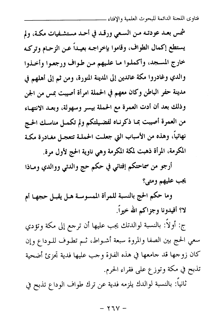ج: أولا: بالنسبة لوالدتك يجب عليها أن ترجع إلى مكة وتؤدي سعي الحج بين الصفا والمروة سبعة أشواط، ثم تطوف للوداع، وإن كان زوجها قد جامعها في هذه الفترة وجب عليها فدية تجزئ أضحية تذبح في مكة وتوزع على فقراء الحرم.