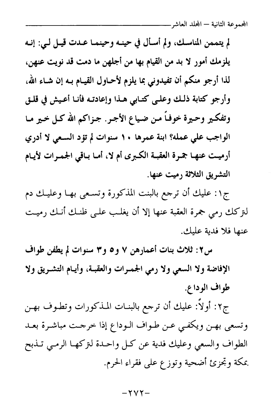 س2: ثلاث بنات أعمارهن 7 و 5 و 3 سنوات لم يطفن طواف الإفاضة ولا السعي ولا رمي الجمرات والعقبة، وأيام التشريق ولا طواف الوداع.