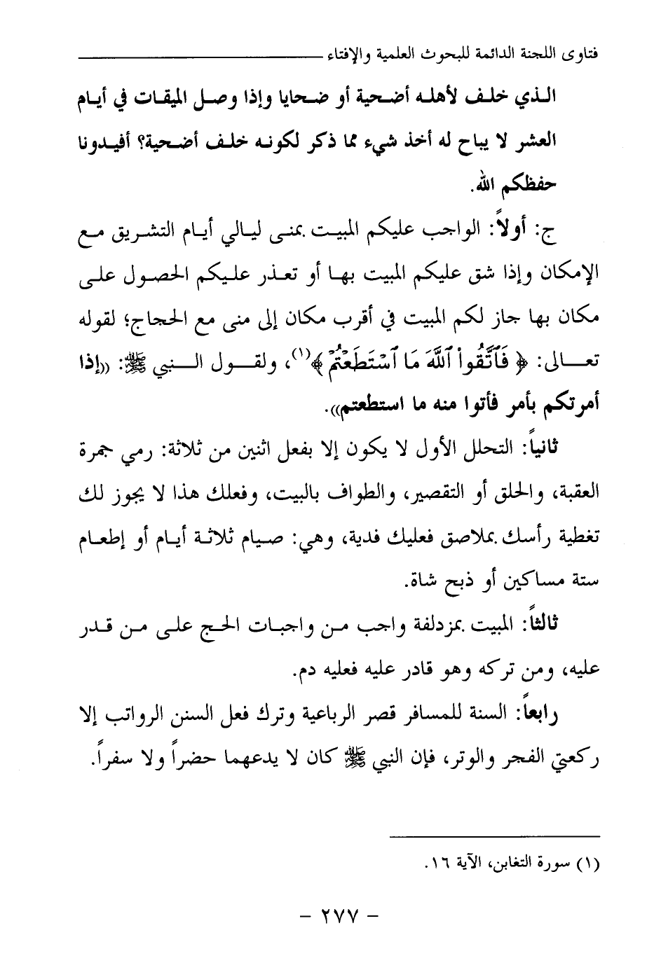 ج: أولا: الواجب عليكم المبيت بمنى ليالي أيام التشريق مع الإمكان، وإذا شق عليكم المبيت بها، أو تعذر عليكم الحصول على مكان بها جاز لكم المبيت في أقرب مكان إلى منى مع الحجاج؛ لقوله تعالى {فَاتَّقُوا اللَّهَ مَا اسْتَطَعْتُمْ} (¬1) ، ولقول النبي -صلى الله عليه وسلم-: «إذا أمرتكم بأمر فأتوا منه ما استطعتم (¬2) » .