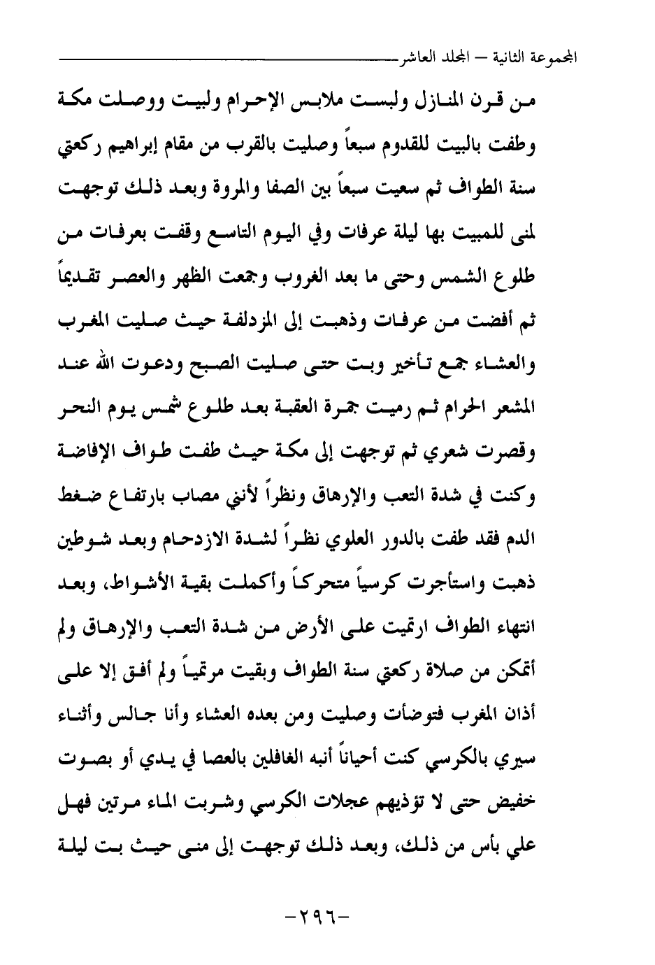من قرن المنازل، ولبست ملابس الإحرام، ولبيت ووصلت مكة وطفت بالبيت للقدوم سبعا، وصليت بالقرب من مقام إبراهيم ركعتي سنة الطواف، ثم سعيت سبعا بين الصفا والمروة، وبعد ذلك توجهت لمنى للمبيت بها ليلة عرفات، وفي اليوم التاسع وقفت بعرفات من طلوع الشمس وحتى ما بعد الغروب وجمعت الظهر والعصر تقديما، ثم أفضت من عرفات وذهبت إلى المزدلفة حيث صليت المغرب والعشاء جمع تأخير، وبت حتى صليت الصبح، ودعوت الله عند المشعر الحرام، ثم رميت جمرة العقبة بعد طلوع شمس يوم النحر، وقصرت شعري، ثم توجهت إلى مكة حيث طفت طواف الإفاضة، وكنت في شدة التعب والإرهاق، ونظرا لأنني مصاب بارتفاع ضغط الدم فقد طفت بالدور العلوي نظرا لشدة الازدحام.