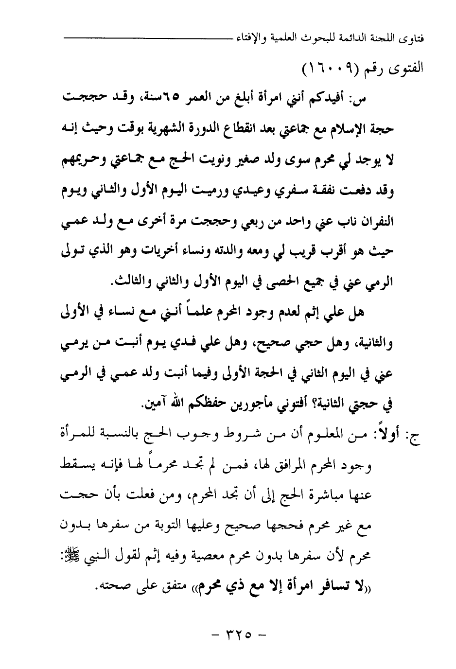 س: أفيدكم أنني امرأة أبلغ من العمر 65 سنة، وقد حججت حجة الإسلام مع جماعتي بعد انقطاع الدورة الشهرية بوقت، وحيث إنه لا يوجد لي محرم سوى ولد صغير، ونويت الحج مع جماعتي وحريمهم، وقد دفعت نفقة سفري وعيدي ورميت اليوم الأول والثاني ويوم النفران ناب عني واحد من ربعي، وحججت مرة أخرى مع ولد عمي حيث هو أقرب قريب لي، ومعه والدته ونساء أخريات، وهو الذي تولى الرمي عني في جميع الحصى في اليوم الأول والثاني والثالث.