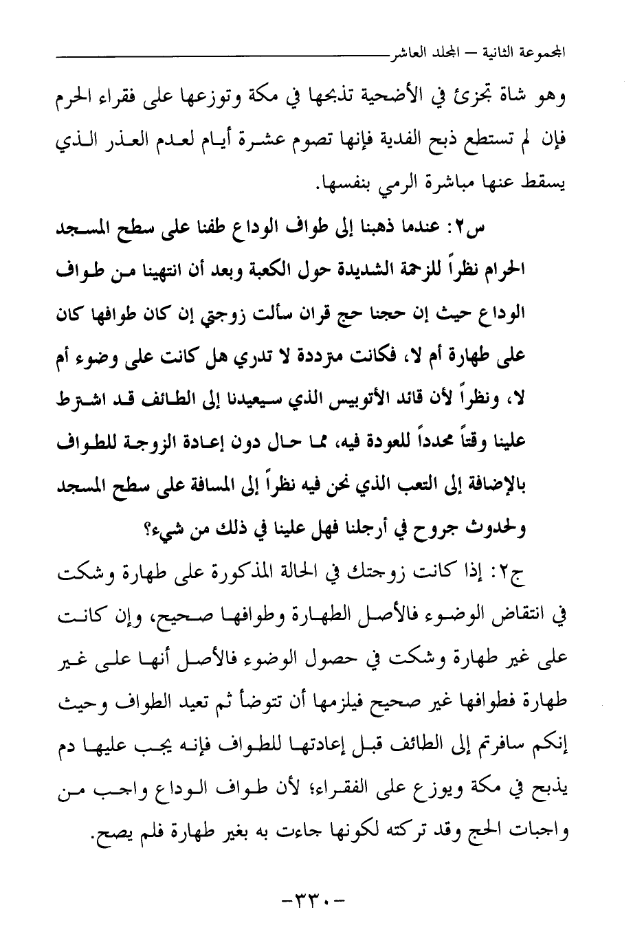 ج2: إذا كانت زوجتك في الحالة المذكورة على طهارة وشكت في انتقاض الوضوء فالأصل الطهارة وطوافها صحيح، وإن كانت على غير طهارة وشكت في حصول الوضوء فالأصل أنها على غير طهارة، فطوافها غير صحيح فيلزمها أن تتوضأ، ثم تعيد الطواف وحيث إنكم سافرتم إلى الطائف قبل إعادتها للطواف فإنه يجب عليها دم يذبح في مكة ويوزع على الفقراء؛ لأن طواف الوداع واجب من واجبات الحج وقد تركته لكونها جاءت به بغير طهارة فلم يصح.