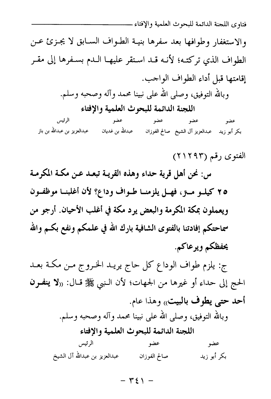 س: نحن أهل قرية حداء، وهذه القرية تبعد عن مكة المكرمة 25 كيلو مترا، فهل يلزمنا طواف وداع؟ لأن أغلبنا موظفون ويعملون بمكة المكرمة والبعض يرد مكة في أغلب الأحيان؟ أرجو من سماحتكم إفادتنا بالفتوى الشافية بارك الله في علمكم، ونفع بكم، والله يحفظكم ويرعاكم.