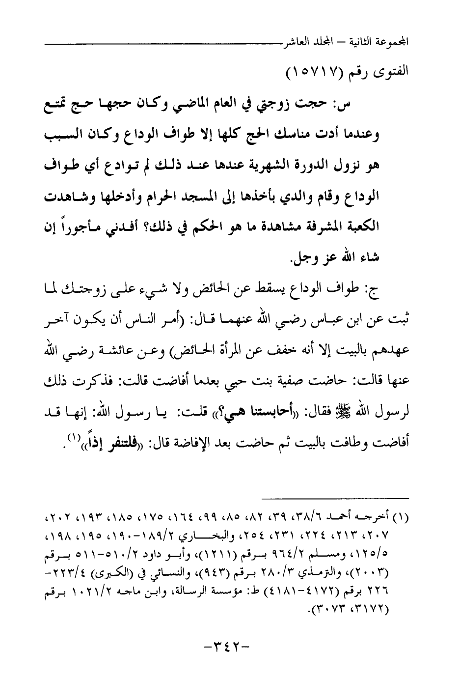 ج: طواف الوداع يسقط عن الحائض ولا شيء على زوجتك؛ لما ثبت عن ابن عباس رضي الله عنهما قال: «أمر الناس أن يكون آخر عهدهم بالبيت إلا أنه خفف عن المرأة الحائض (¬1) » ، وعن عائشة رضي الله عنها قالت: «حاضت صفية بنت حيي بعد ما أفاضت قالت: فذكرت ذلك لرسول الله -صلى الله عليه وسلم- فقال: أحابستنا هي؟ قلت: يا رسول الله: إنها قد أفاضت وطافت بالبيت ثم حاضت بعد الإفاضة قال: فلتنفر إذا (¬2) »