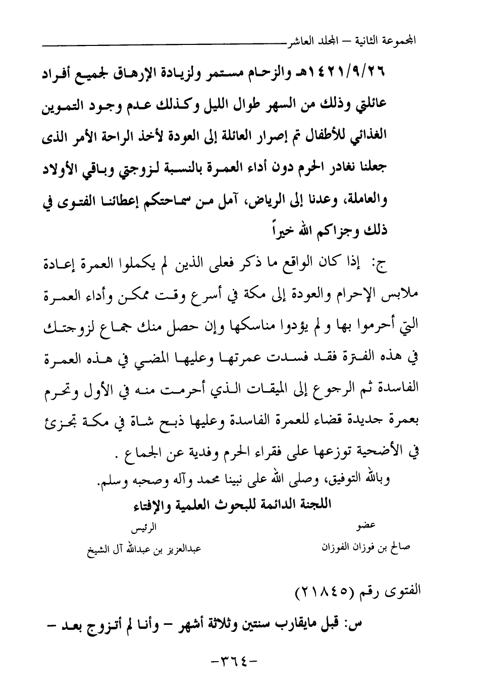 26\ 9\ 1421هـ والزحام مستمر، ولزيادة الإرهاق لجميع أفراد عائلتي وذلك من السهر طوال الليل، وكذلك عدم وجود التموين الغذائي للأطفال تم إصرار العائلة إلى العودة لأخذ الراحلة، الأمر الذي جعلنا نغادر الحرم دون أداء العمرة بالنسبة لزوجتي وباقي الأولاد والعاملة، وعدنا إلى الرياض، آمل من سماحتكم إعطاءنا الفتوى في ذلك وجزاكم الله خيرا.