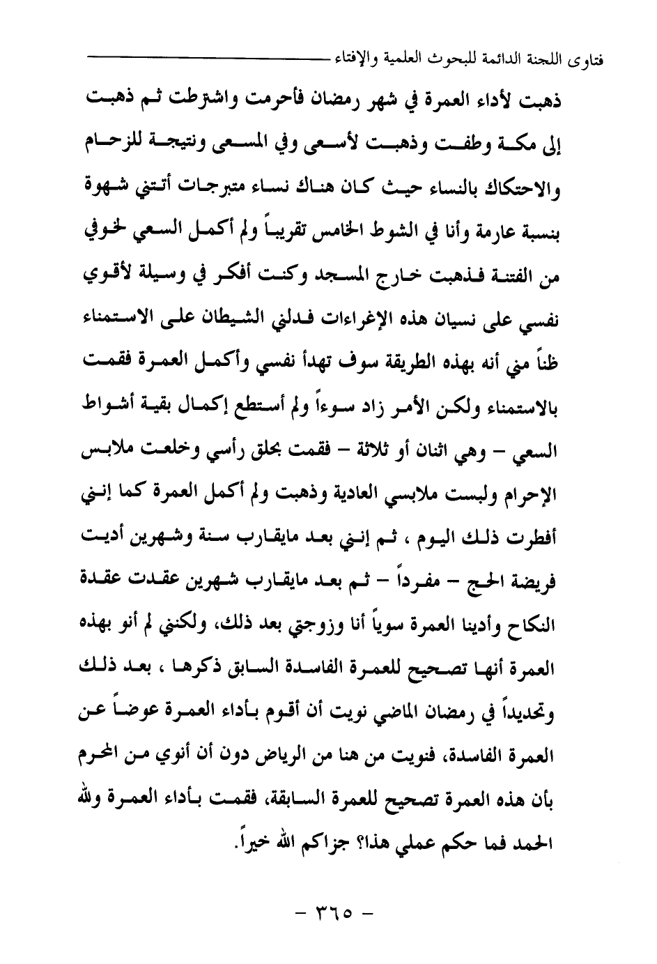ذهبت لأداء العمرة في شهر رمضان فأحرمت واشترطت، ثم ذهبت إلى مكة، وطفت وذهبت لأسعى، وفي المسعى ونتيجة للزحام والاحتكاك بالنساء حيث كان هناك نساء متبرجات أتتني شهوة بنسبة عارمة، وأنا في الشوط الخامس تقريبا ولم أكمل السعي لخوفي من الفتنة، فذهبت خارج المسجد وكنت أفكر في وسيلة لأقوي نفسي على نسيان هذه الإغراءات، فدلني الشيطان على الاستمناء ظنا منى أنه بهذه الطريقة سوف تهدأ نفسي، وأكمل العمرة فقمت بالاستمناء، ولكن الأمر زاد سوءا، ولم أستطع إكمال بقية أشواط السعي - وهي اثنان أو ثلاثة - فقمت بحلق رأسي، وخلعت ملابس الإحرام ولبست ملابسي العادية، وذهبت ولم أكمل العمرة، كما أنني أفطرت ذلك اليوم، ثم إنني بعد ما يقارب سنة وشهرين أديت فريضة الحج - مفردا - ثم بعد ما يقارب شهرين عقدت عقدة النكاح، وأدينا العمرة سويا أنا وزوجتي بعد ذلك، ولكنني لم أنو بهذه العمرة أنها تصحيح للعمرة الفاسدة السابق ذكرها، بعد ذلك وتحديدا في رمضان الماضي نويت أن أقوم بأداء العمرة عوضا عن العمرة الفاسدة، فنويت من هنا من الرياض دون أن أنوي من المحرم بأن هذه العمرة تصحيح للعمرة السابقة، فقمت بأداء العمرة ولله الحمد فما حكم عملي هذا؟ جزاكم الله خيرا.