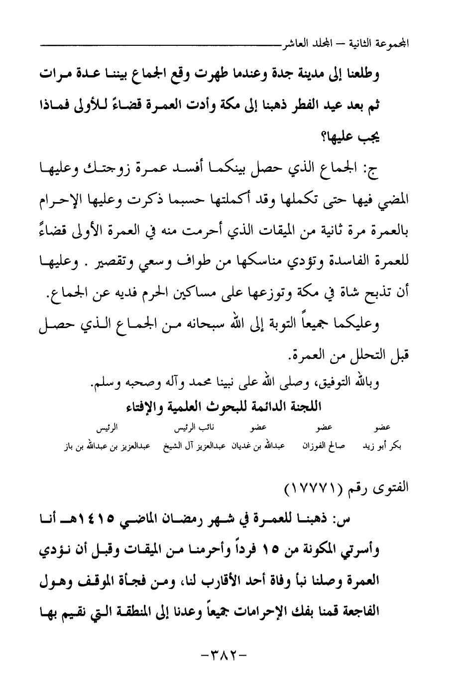 ج: الجماع الذي حصل بينكما أفسد عمرة زوجتك، وعليها المضي فيها حتى تكملها، وقد أكملتها حسبما ذكرت وعليها الإحرام بالعمرة مرة ثانية من الميقات الذي أحرمت منه في العمرة الأولى قضاء للعمرة الفاسدة، وتؤدي مناسكها من طواف وسعي وتقصير. وعليها أن تذبح شاة في مكة وتوزعها على مساكين الحرم فدية عن الجماع.