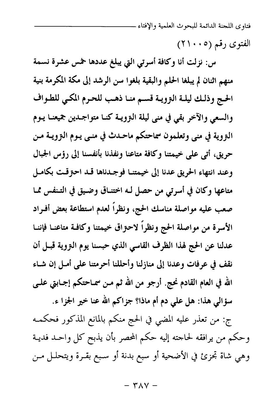 س: نزلت أنا وكافة أسرتي التي يبلغ عددها خمس عشرة نسمة، منهم اثنان لم يبلغا الحلم، والبقية بلغوا سن الرشد إلى مكة المكرمة بنية الحج، وذلك ليلة التروية، قسم منا ذهب للحرم المكي للطواف والسعي، والآخر بقي في منى ليلة التروية، كنا متواجدين جميعنا يوم التروية في منى، وتعلمون سماحتكم ما حدث في منى يوم التروية من حريق، أتى على خيمتنا وكافة متاعنا، ونفذنا بأنفسنا إلى رءوس الجبال، وعند انتهاء الحريق عدنا إلى خيمتنا، فوجدناها قد احترقت بكامل متاعها، وكان في أسرتي من حصل له اختناق وضيق في التنفس مما صعب عليه مواصلة مناسك الحج، ونظرا لعدم استطاعة بعض أفراد الأسرة من مواصلة الحج، ونظرا لاحتراق خيمتنا وكافة متاعنا فإننا عدلنا عن الحج لهذا الظرف القاسي الذي حبسنا يوم التروية قبل أن نقف في عرفات، وعدنا إلى منازلنا، وأحللنا أحرمتنا على أمل إن شاء الله في العام القادم نحج. أرجو من الله ثم من سماحتكم إجابتي على سؤالي هذا: هل علي دم أم ماذا؟ جزاكم الله عنا خير الجزاء.