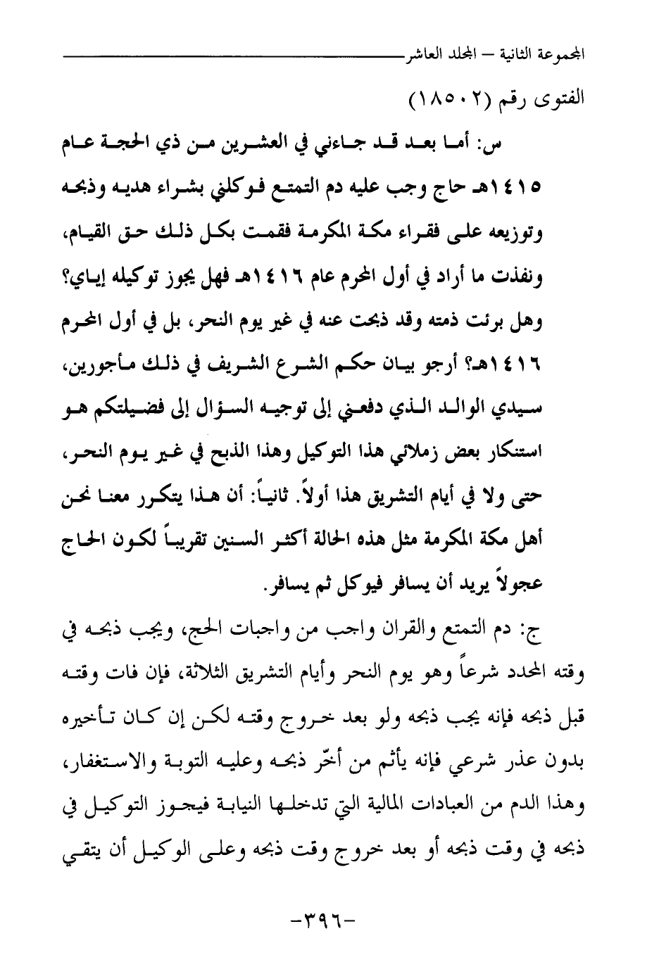 س: أما بعد قد جاءني في العشرين من ذي الحجة عام 1415هـ حاج وجب عليه دم التمتع فوكلني بشراء هديه وذبحه وتوزيعه على فقراء مكة المكرمة فقمت بكل ذلك حق القيام، ونفذت ما أراد في أول المحرم عام 1416هـ، فهل يجوز توكيله إياي؟ وهل برئت ذمته وقد ذبحت عنه في غير يوم النحر، بل في أول المحرم 1416هـ؟ أرجو بيان حكم الشرع الشريف في ذلك مأجورين، سيدي الوالد الذي دفعني إلى توجيه السؤال إلى فضيلتكم هو استنكار بعض زملائي هذا التوكيل، وهذا الذبح في غير يوم النحر، حتى ولا في أيام التشريق هذا أولا.