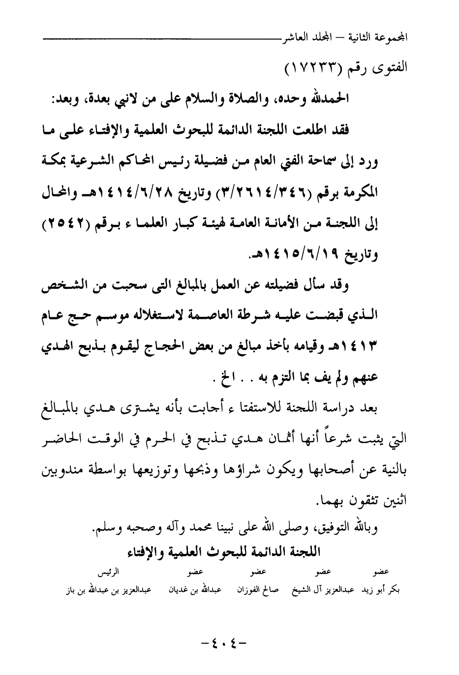وقد سأل فضيلته عن العمل بالمبالغ التي سحبت من الشخص الذي قبضت عليه شرطة العاصمة لاستغلاله موسم حج عام 1413 هـ، وقيامه بأخذ مبالغ من بعض الحجاج؛ ليقوم بذبح الهدي عنهم، ولم يف بما التزم به. .إلخ.