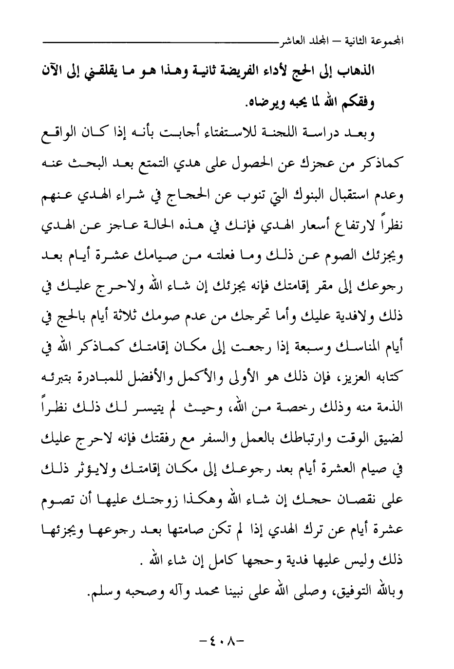 وبعد دارسة اللجنة للاستفتاء أجابت: بأنه إذا كان الواقع كما ذكر من عجزك عن الحصول على هدي التمتع بعد البحث عنه، وعدم استقبال البنوك التي تنوب عن الحجاج في شراء الهدي عنهم، نظرا لارتفاع أسعار الهدي فإنك في هذه الحالة عاجز عن الهدي، ويجزئك الصوم عن ذلك، وما فعلته من صيامك عشرة أيام بعد رجوعك إلى مقر إقامتك فإنه يجزئك إن شاء الله، ولا حرج عليك في ذلك، ولا فدية عليك.