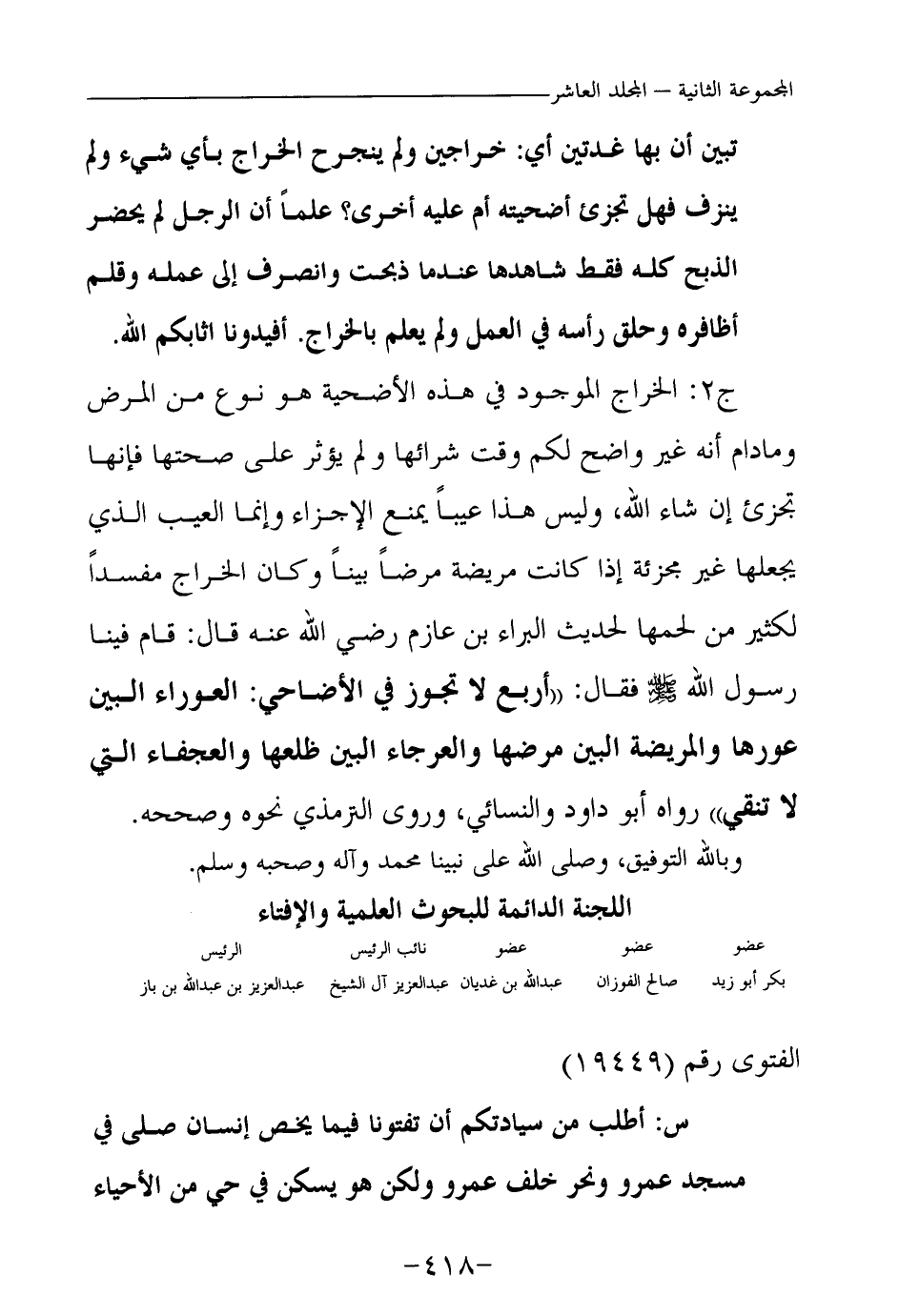 ج2: الخراج الموجود في هذه الأضحية هو نوع من المرض وما دام أنه غير واضح لكم وقت شرائها ولم يؤثر على صحتها فإنها تجزئ إن شاء الله، وليس هذا عيبا يمنع الإجزاء، وإنما العيب الذي يجعلها غير مجزئة إذا كانت مريضة مرضا بينا وكان الخراج مفسدا لكثير من لحمها؛ لحديث البراء بن عازب رضي الله عنه قال: قام فينا رسول الله - صلى الله عليه وسلم - فقال: «أربع لا تجوز في الأضاحي: العوراء البين عورها، والمريضة البين مرضها، والعرجاء البين ظلعها، والعجفاء التي لا تنقي (¬1) » رواه أبو داود والنسائي، وروى الترمذي نحوه وصححه.