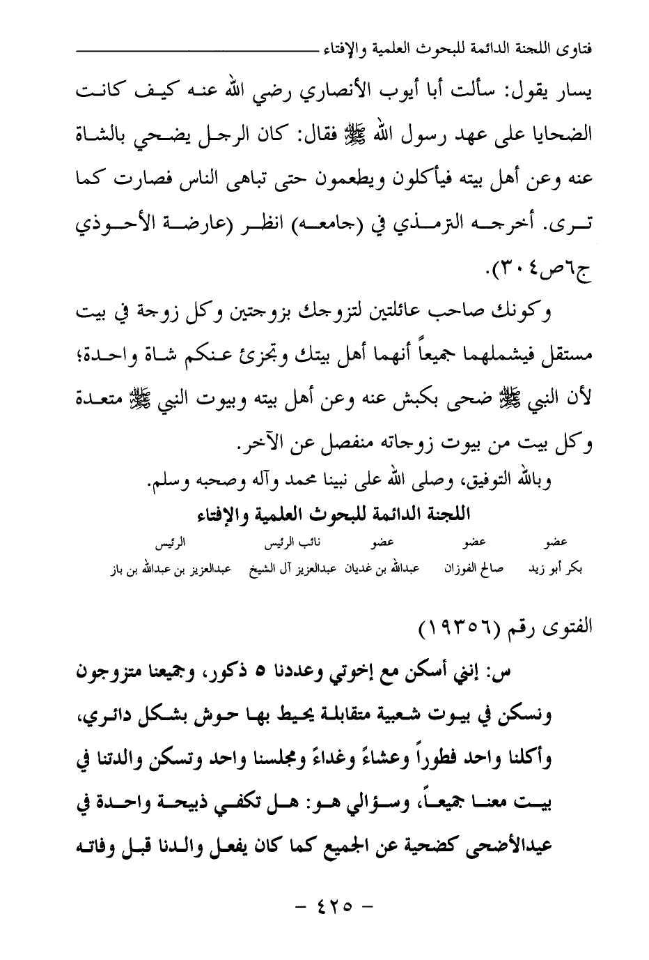 س: إنني أسكن مع إخوتي وعددنا 5 ذكور، وجميعنا متزوجون، ونسكن في بيوت شعبية متقابلة يحيط بها حوش بشكل دائري، وأكلنا واحد: فطورا وعشاء وغداء، ومجلسنا واحد، وتسكن والدتنا في بيت معنا جميعا، وسؤالي هو: هل تكفي ذبيحة واحدة في عيد الأضحى كضحية عن الجميع كما كان يفعل والدنا قبل وفاته