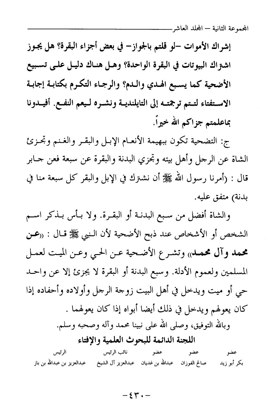 والشاة أفضل من سبع البدنة أو البقرة. ولا بأس بذكر اسم الشخص أو الأشخاص عند ذبح الأضحية؛ لأن النبي - صلى الله عليه وسلم - قال: «عن محمد وآل محمد (¬2) » ، وتشرع الأضحية عن الحي، وعن الميت لعمل المسلمين ولعموم الأدلة.