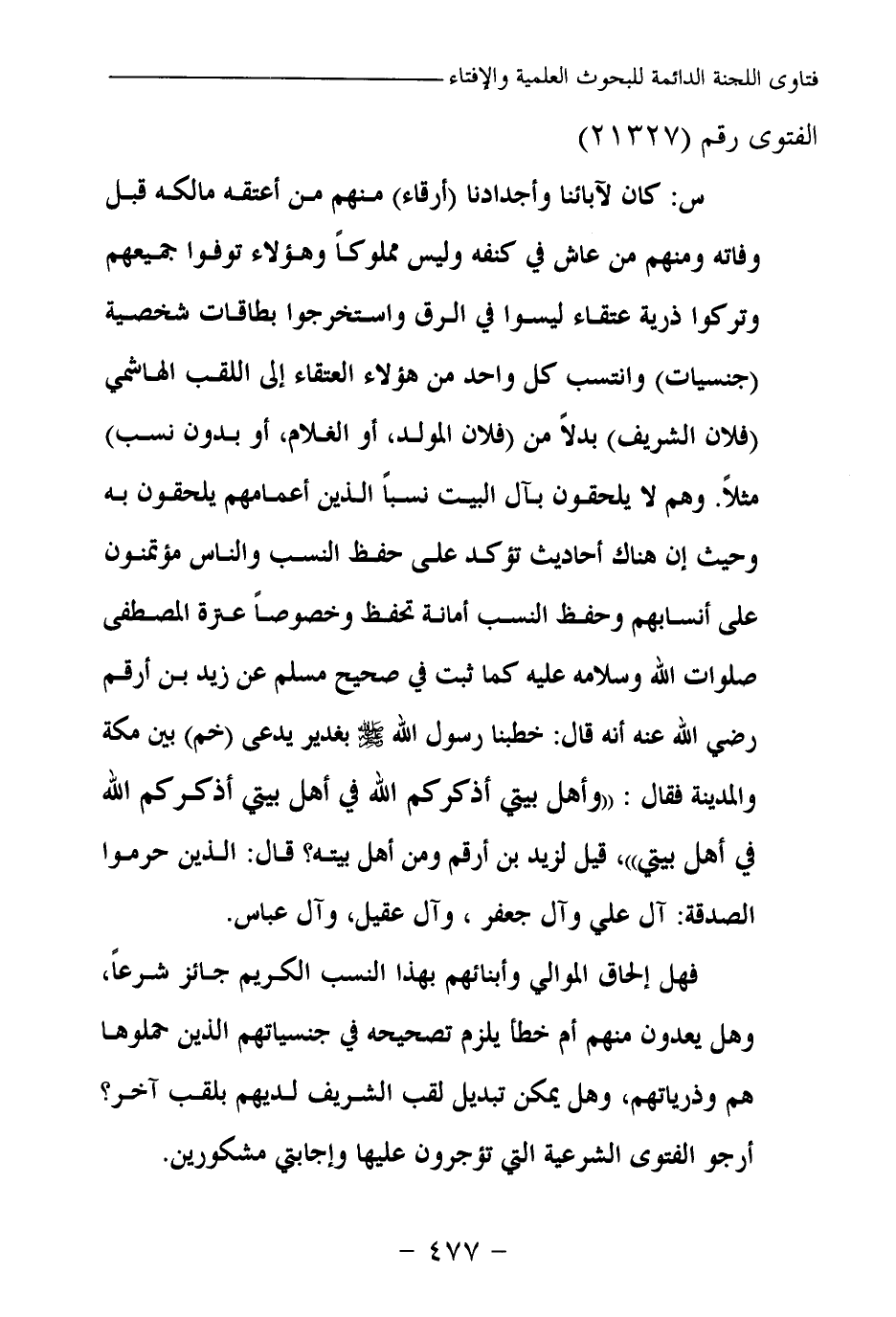 س: كان لآبائنا وأجدادنا (أرقاء) منهم من أعتقه مالكه قبل وفاته ومنهم من عاش في كنفه وليس مملوكا، وهؤلاء توفوا جميعهم وتركوا ذرية عتقاء ليسوا في الرق، واستخرجوا بطاقات شخصية (جنسيات) وانتسب كل واحد من هؤلاء العتقاء إلى اللقب الهاشمي (فلان الشريف) بدلا من (فلان المولد، أو الغلام، أو بدون نسب) مثلا. وهم لا يلحقون بآل البيت نسبا الذين أعمامهم يلحقون به، وحيث إن هناك أحاديث تؤكد على حفظ النسب والناس مؤتمنون على أنسابهم، وحفظ النسب أمانة تحفظ، وخصوصا عترة المصطفى صلوات الله وسلامه عليه، كما ثبت في صحيح مسلم عن زيد بن أرقم رضي الله عنه أنه قال: خطبنا رسول الله - صلى الله عليه وسلم - بغدير يدعى (خم) بين مكة والمدينة فقال: «وأهل بيتي أذكركم الله في أهل بيتي أذكركم الله في أهل بيتي (¬1) » ، قيل لزيد بن أرقم: ومن أهل بيته؟ قال: الذين حرموا الصدقة: آل علي وآل جعفر، وآل عقيل، وآل عباس.