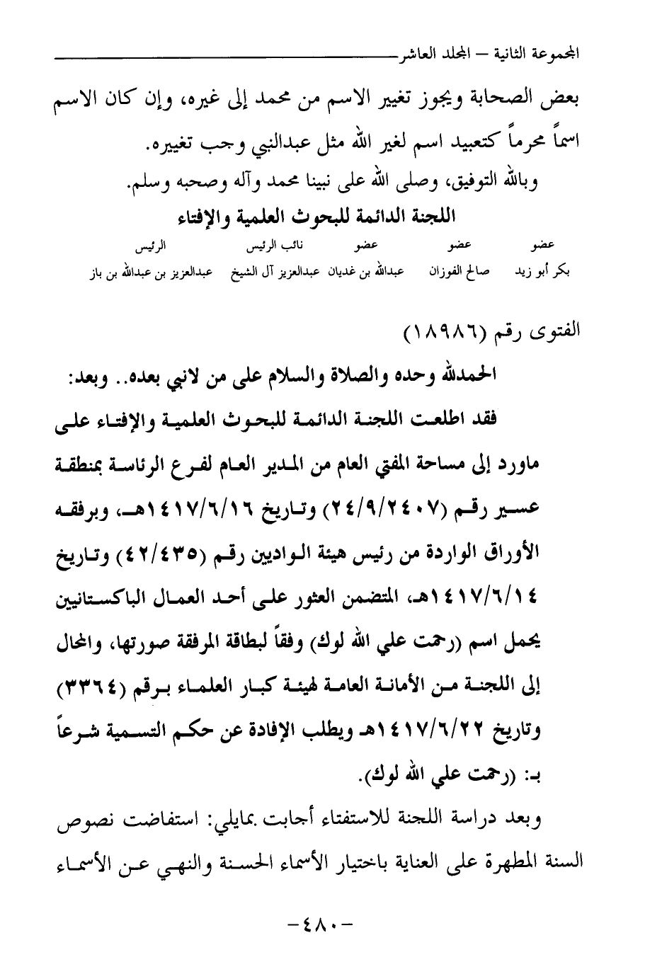 فقد اطلعت اللجنة الدائمة للبحوث العلمية والإفتاء على ما ورد إلى سماحة المفتي العام من المدير العام لفرع الرئاسة بمنطقة عسير رقم (2407 \ 9\ 24) وتاريخ 16\6\1417هـ، وبرفقه الأوراق الواردة من رئيس هيئة الواديين رقم (435 \ 42) وتاريخ 14\6\1417هـ، المتضمن العثور على أحد العمال الباكستانيين يحمل اسم (رحمت علي الله لوك) وفقا للبطاقة المرفقة صورتها، والمحال إلى اللجنة من الأمانة العامة لهيئة كبار العلماء برقم (3364) وتاريخ 22\6\1417هـ ويطلب الإفادة عن حكم التسمية شرعا بـ: (رحمت علي الله لوك) .