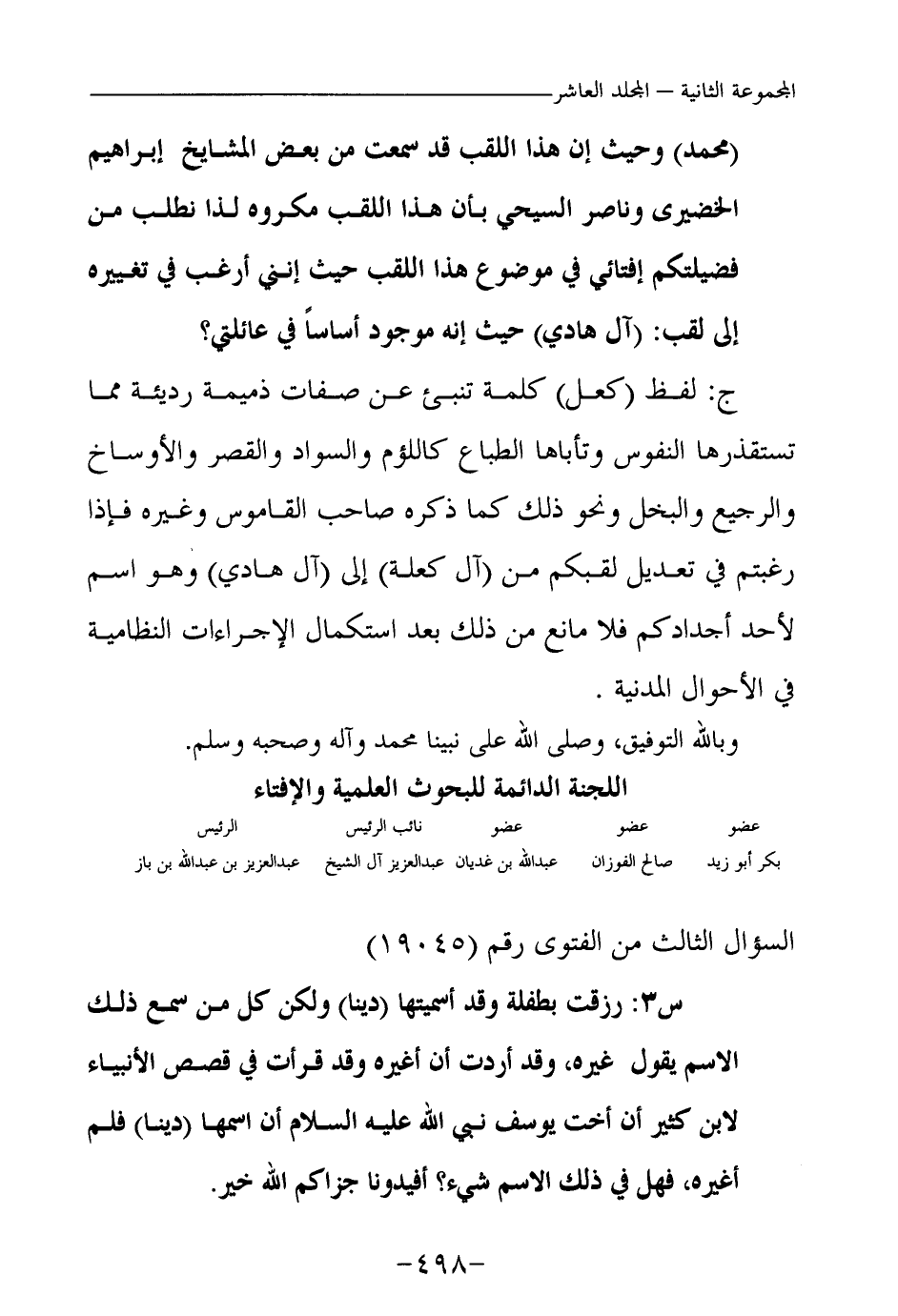 (محمد) وحيث إن هذا اللقب قد سمعت من بعض المشايخ إبراهيم الخضيري، وناصر السيحي بأن هذا اللقب مكروه؛ لذا نطلب من فضيلتكم إفتائي في موضوع هذا اللقب، حيث إنني أرغب في تغييره إلى لقب: (آل هادي) حيث إنه موجود أساسا في عائلتي؟