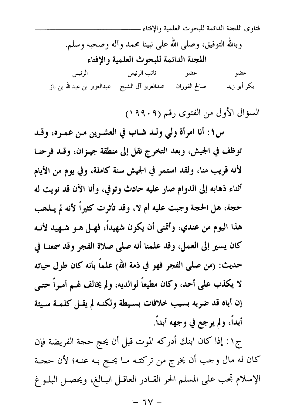 س1: أنا امرأة ولي ولد شاب في العشرين من عمره، وقد توظف في الجيش، وبعد التخرج نقل إلى منطقة جيزان، وقد فرحنا لأنه قريب منا، ولقد استمر في الجيش سنة كاملة، وفي يوم من الأيام أثناء ذهابه إلى الدوام صار عليه حادث وتوفي، وأنا الآن قد نويت له حجة، هل الحجة وجبت عليه أم لا، وقد تأثرت كثيرا؛ لأنه لم يذهب هذا اليوم من عندي، وأتمنى أن يكون شهيدا، فهل هو شهيد؟ لأنه كان يسير إلى العمل، وقد علمنا أنه صلى صلاة الفجر، وقد سمعنا في حديث: «من صلى الفجر فهو في ذمة الله (¬1) » علما بأنه كان طول حياته لا يكذب على أحد، وكان مطيعا لوالديه، ولم يخالف لهم أمرا حتى إن أباه قد ضربه بسبب خلافات بسيطة، ولكنه لم يقل كلمة سيئة أبدا، ولم يرجع في وجهه أبدا.