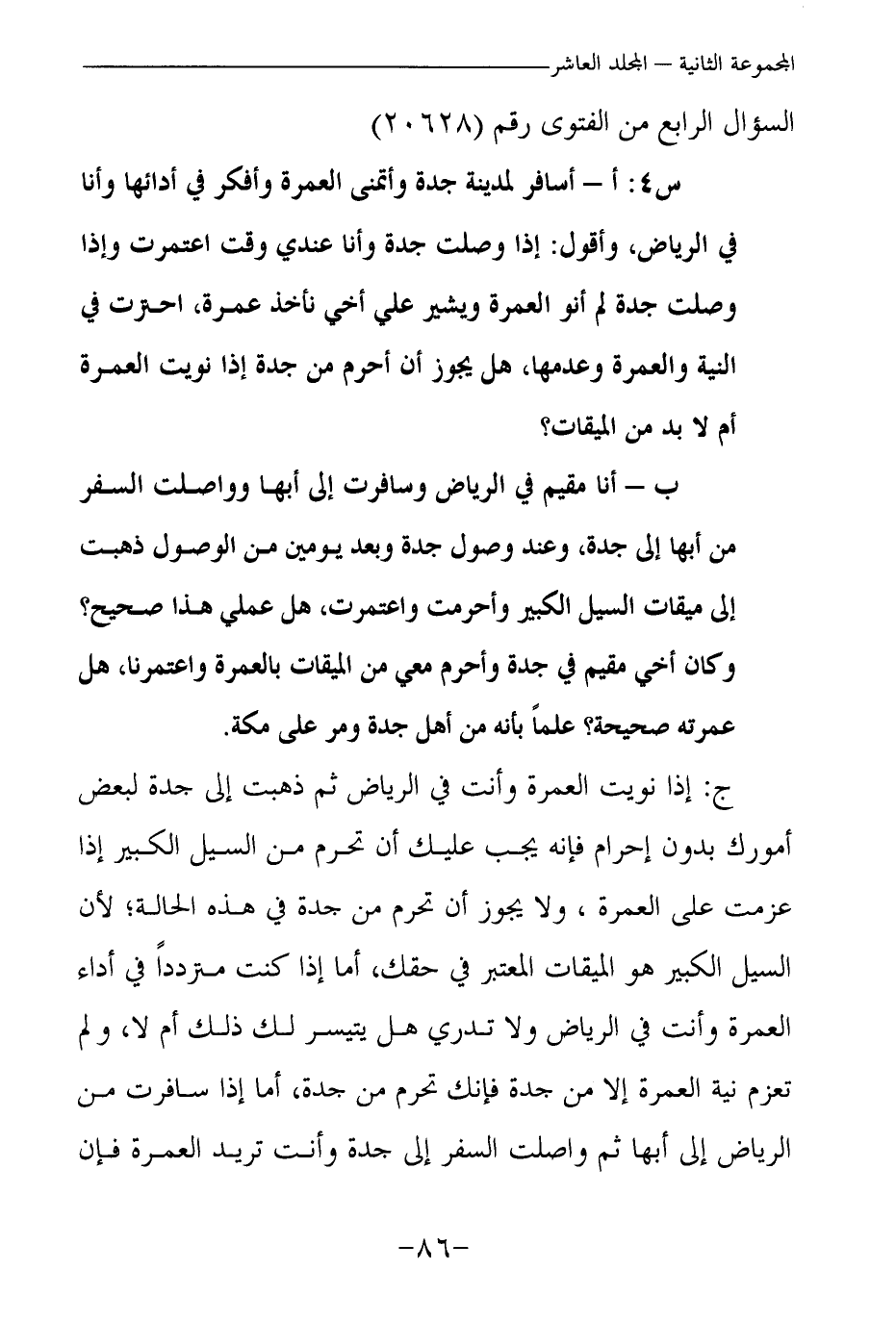 س4: أ – أسافر لمدينة جدة وأتمنى العمرة وأفكر في أدائها وأنا في الرياض، وأقول: إذا وصلت جدة وأنا عندي وقت اعتمرت، وإذا وصلت جدة لم أنو العمرة، ويشير علي أخي نأخذ عمرة، احترت في النية والعمرة وعدمها، هل يجوز أن أحرم من جدة إذا نويت العمرة أم لا بد من الميقات؟