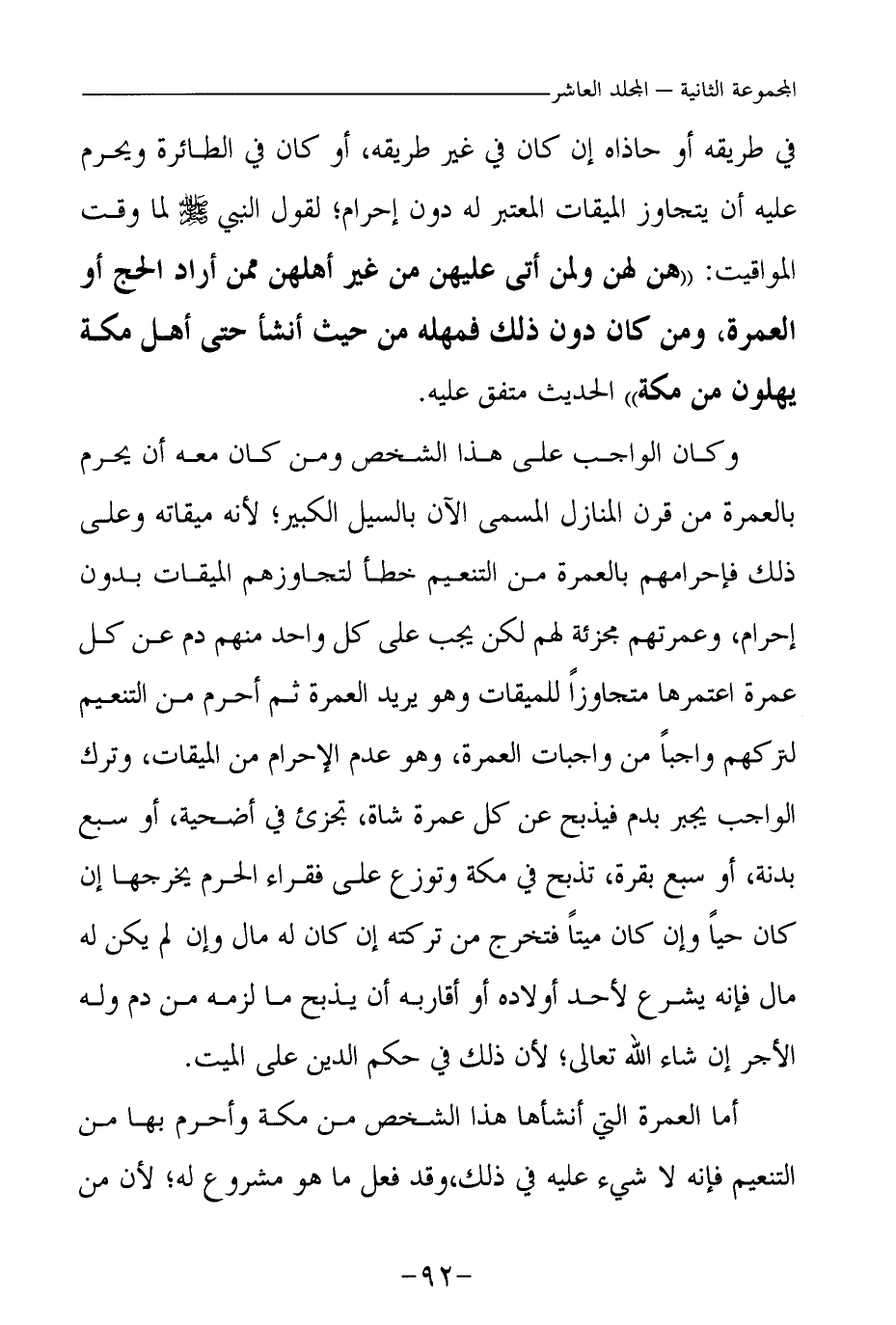 وكان الواجب على هذا الشخص ومن كان معه أن يحرم بالعمرة من قرن المنازل المسمى الآن بالسيل الكبير؛ لأنه ميقاته وعلى ذلك فإحرامهم بالعمرة من التنعيم خطأ؛ لتجاوزهم الميقات بدون إحرام، وعمرتهم مجزئة لهم، لكن يجب على كل واحد منهم دم عن كل عمرة اعتمرها متجاوزا للميقات وهو يريد العمرة، ثم أحرم من التنعيم لتركهم واجبا من واجبات العمرة، وهو عدم الإحرام من الميقات، وترك الواجب يجبر بدم؛ فيذبح عن كل عمرة شاه، تجزئ في أضحية، أو سبع بدنة، أو سبع بقرة، تذبح في مكة وتوزع على فقراء الحرم، يخرجها إن كان حيا، وإن كان ميتا فتخرج من تركته إن كان له مال، وإن لم يكن له مال فإنه يشرع لأحد أولاده أو أقاربه أن يذبح ما لزمه من دم وله الأجر إن شاء الله تعالى؛ لأن ذلك في حكم الدين على الميت.