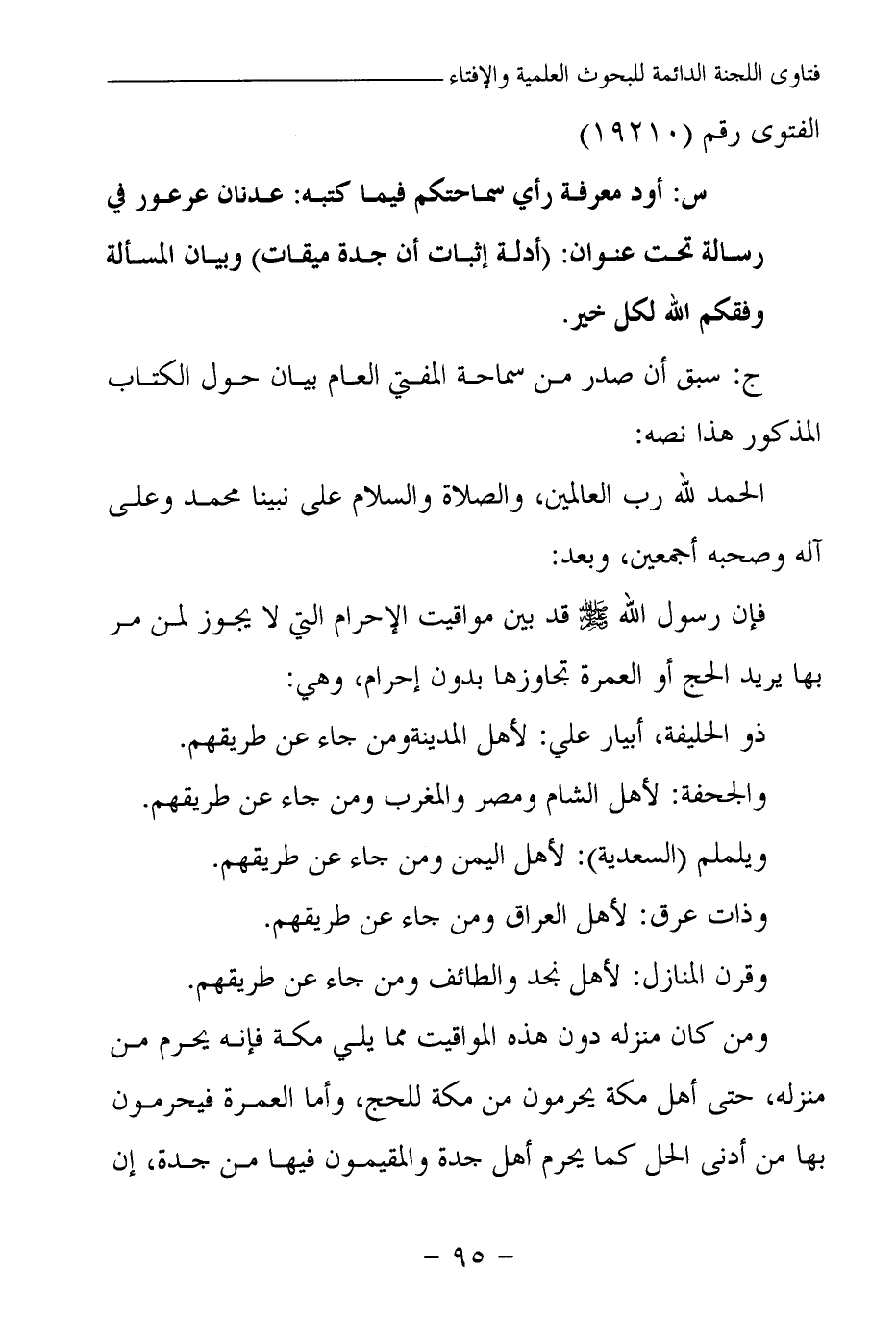 س: أود معرفة رأي سماحتكم فيما كتبه: عدنان عرعور في رسالة تحت عنوان: «أدلة إثبات أن جدة ميقات» وبيان المسألة وفقكم الله لكل خير.