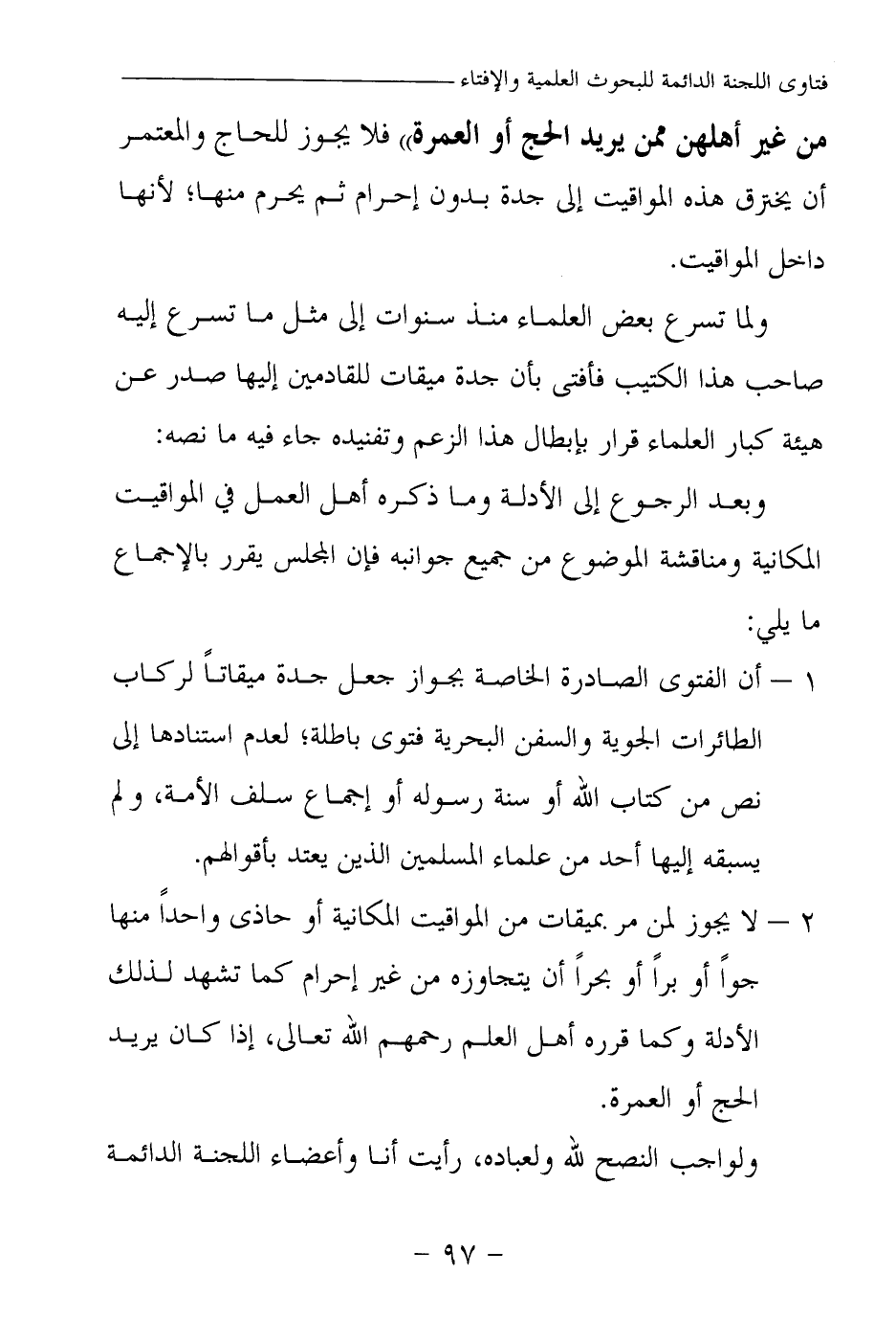 1 – أن الفتوى الصادرة الخاصة بجواز جعل جدة ميقاتا لركاب الطائرات الجوية والسفن البحرية فتوى باطلة؛ لعدم استنادها إلى نص من كتاب الله أو سنة رسوله أو إجماع سلف الأمة، ولم يسبقه إليها أحد من علماء المسلمين الذين يعتد بأقوالهم.