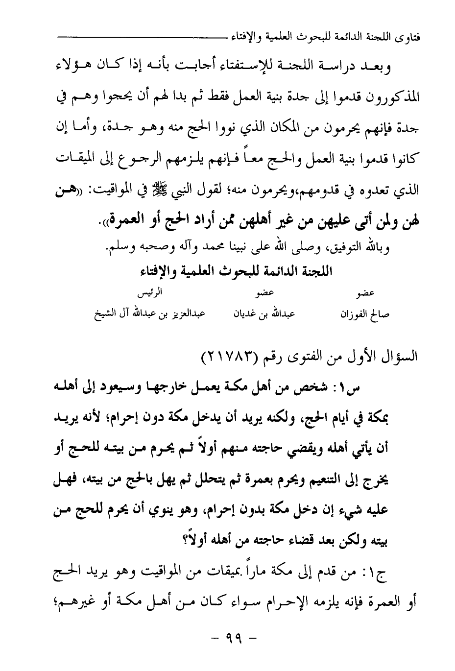 وبعد دراسة اللجنة للاستفتاء أجابت: بأنه إذا كان هؤلاء المذكورون قدموا إلى جدة بنية العمل فقط، ثم بدا لهم أن يحجوا وهم في جدة فإنهم يحرمون من المكان الذي نووا الحج منه وهو جدة، وأما إن كانوا قدموا بنية العمل والحج معا فإنهم يلزمهم الرجوع إلى الميقات الذي تعدوه في قدومهم، ويحرمون منه؛ لقول النبي -صلى الله عليه وسلم- في المواقيت: «هن لهن ولمن أتى عليهن من غير أهلهن ممن أراد الحج أو العمرة (¬1) » .