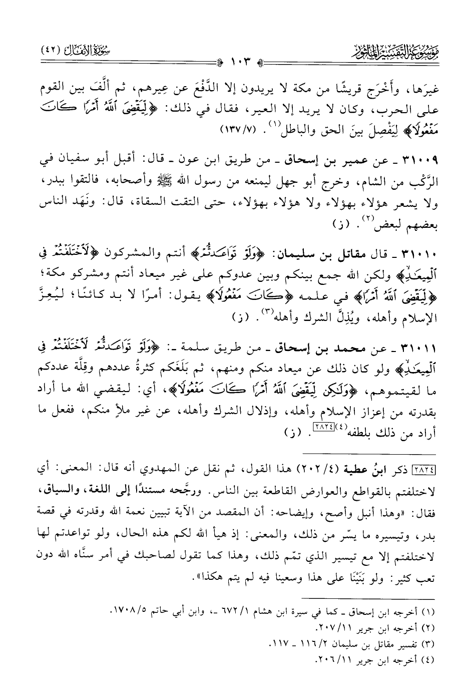 ٣١٠١١ - عن محمد بن إسحاق -من طريق سلمة-: {ولو تواعدتم لاختلفتم في الميعاد} ولو كان ذلك عن ميعاد منكم ومنهم، ثم بَلَغَكم كثرةُ عددهم وقِلَّة عددكم ما لقيتموهم، {ولكن ليقضي الله أمرا كان مفعولا} أي: ليقضي الله ما أراد بقدرته من إعزاز الإسلام وأهله، وإذلال الشرك وأهله، عن غير ملأٍ منكم، ففعل ما أراد من ذلك بلطفه (¬٤) [٢٨٢٤]. (ز)