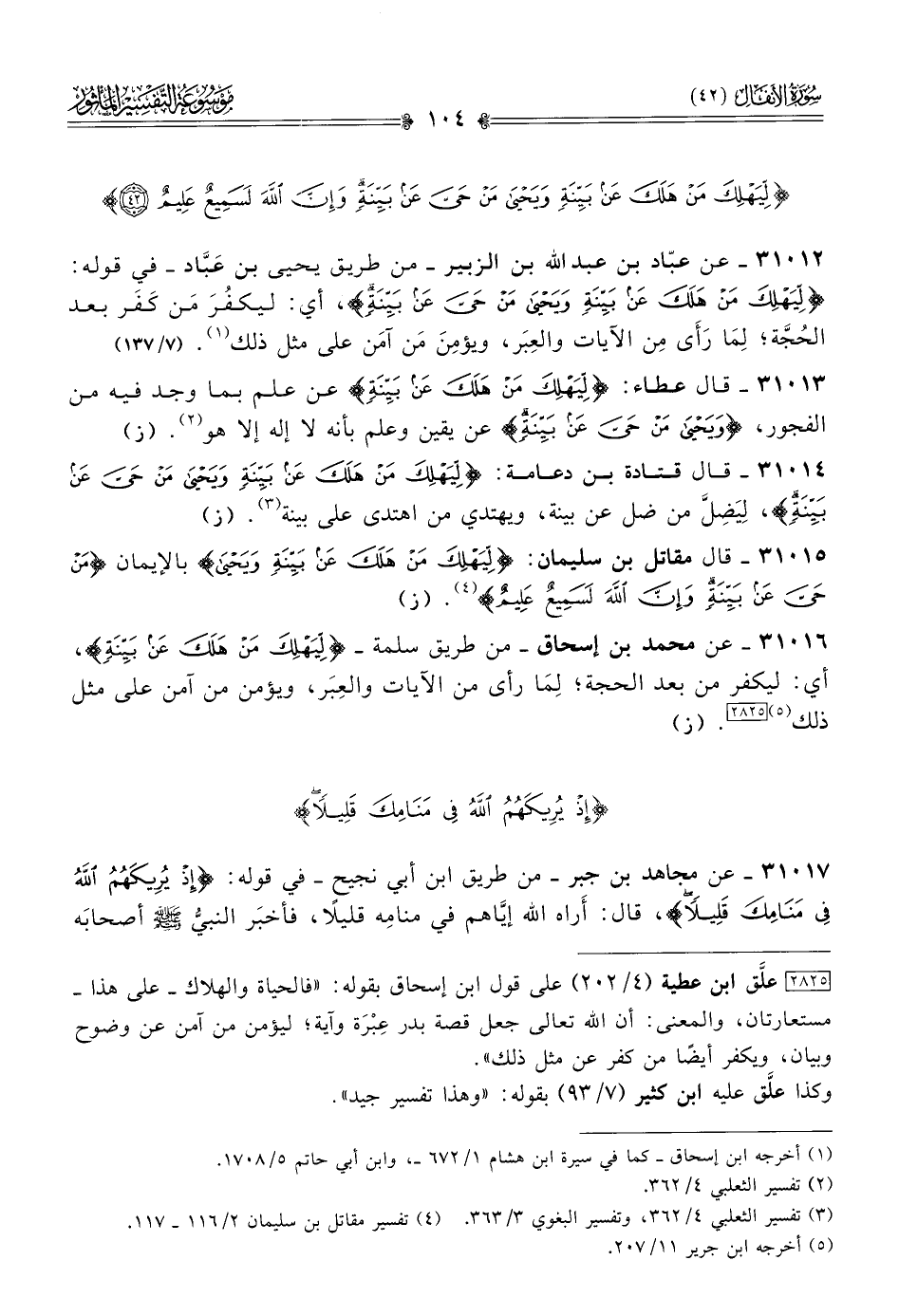٣١٠١٢ - عن عبّاد بن عبد الله بن الزبير -من طريق يحيى بن عَبّاد- في قوله: {ليهلك من هلك عن بينة ويحيى من حي عن بينة}، أي: ليكفُرَ مَن كَفَر بعد الحُجَّة؛ لِما رَأى مِن الآيات والعِبَر، ويؤمِنَ مَن آمَن على مثل ذلك (¬١). (٧/ ١٣٧)