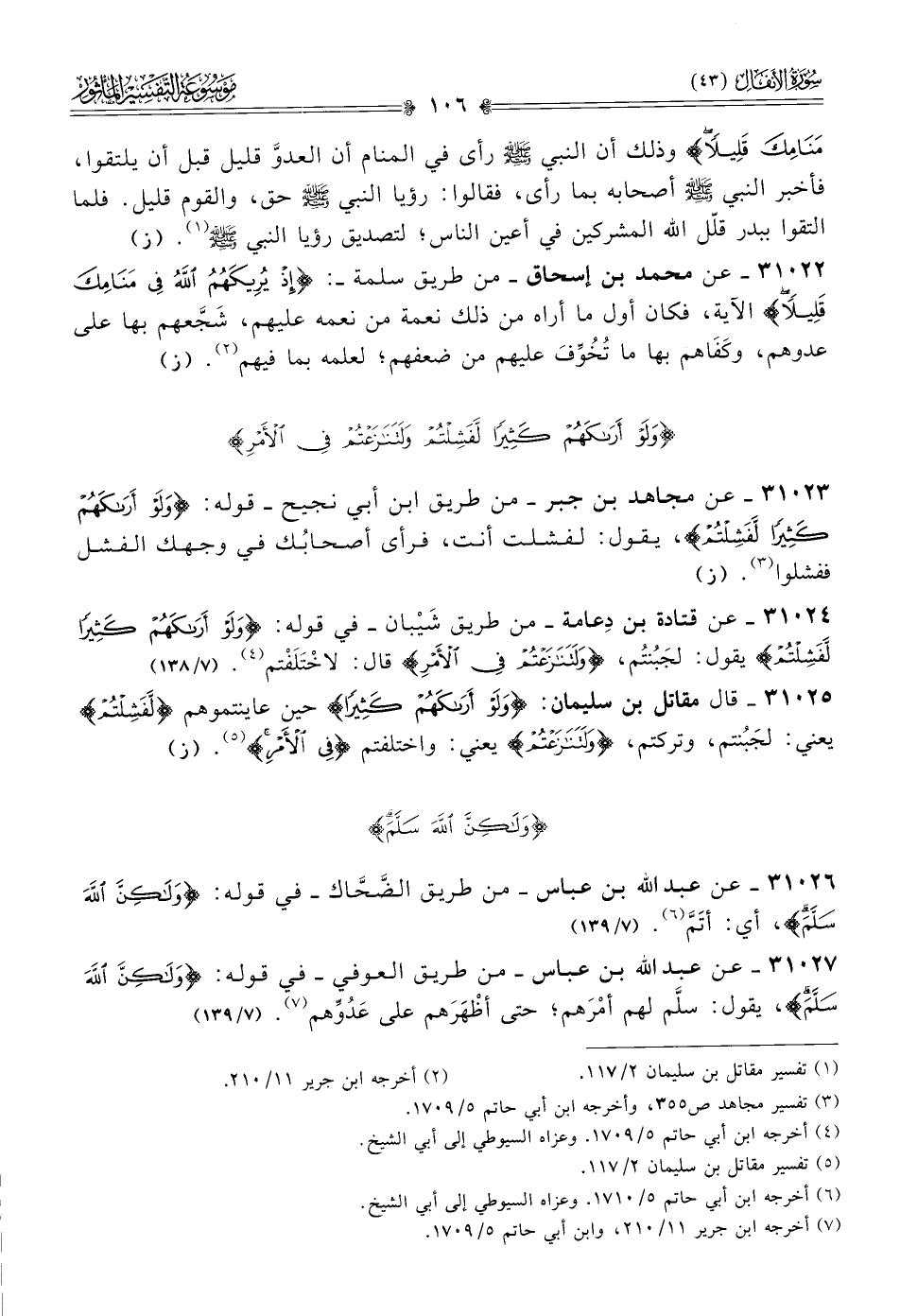 ٣١٠٢٢ - عن محمد بن إسحاق -من طريق سلمة-: {إذ يريكهم الله في منامك قليلا} الآية، فكان أول ما أراه من ذلك نعمة من نعمه عليهم، شَجَّعهم بها على عدوهم، وكَفاهم بها ما تُخُوِّفَ عليهم من ضعفهم؛ لعلمه بما فيهم (¬٢). (ز)