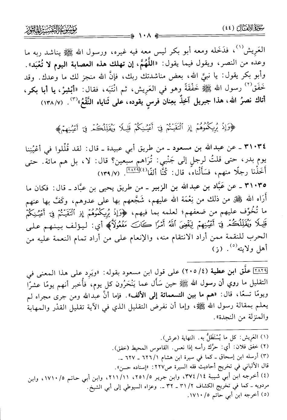 ٣١٠٣٤ - عن عبد الله بن مسعود -من طريق أبي عبيدة- قال: لقد قُلِّلوا في أعْيُنِنا يوم بدر، حتى قلتُ لرجلٍ إلى جَنْبي: تُراهم سبعين؟ قال: لا، بل هم مائة. حتى أخَذْنا رجلًا منهم، فسَأَلْناه، قال: كُنّا ألفًا (¬٤) [٢٨٢٩]. (٧/ ١٣٩)