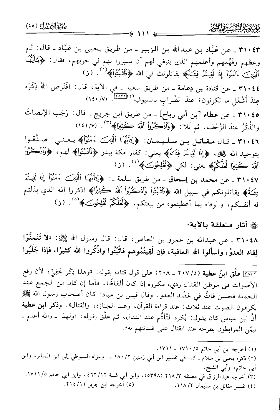 ٣١٠٤٥ - عن عطاء [بن أبي رباح]-من طريق ابن جريج- قال: وجَب الإنصاتُ والذِّكْرُ عندَ الزَّحْف. ثم تَلا: {واذكروا الله كثيرا} (¬٣). (٧/ ١٤١)