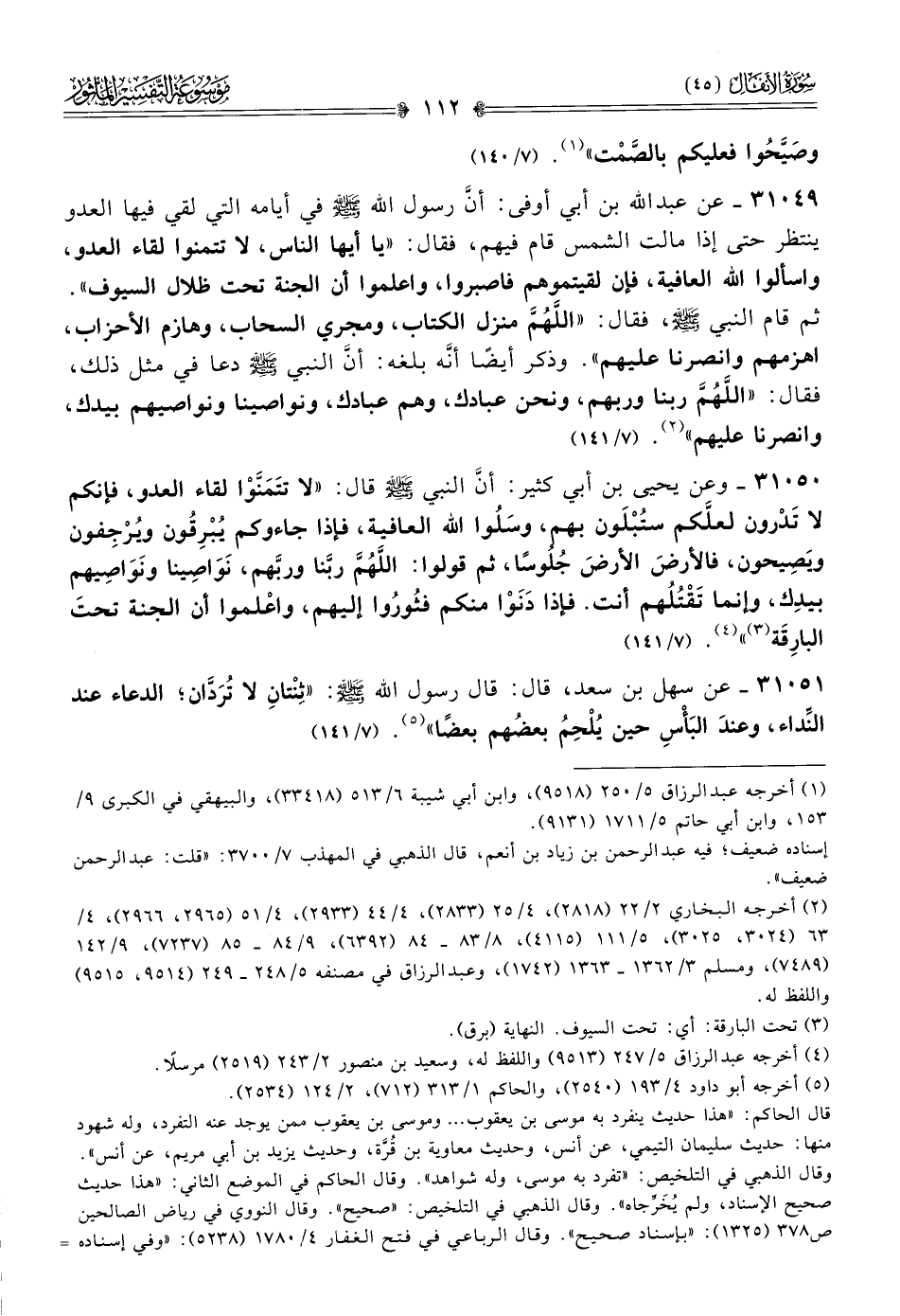 ٣١٠٤٩ - عن عبدالله بن أبي أوفى، أنّ رسول الله - صلى الله عليه وسلم - في أيامه التي لقي فيها العدو ينتظر حتى إذا مالت الشمس قام فيهم، فقال: «يا أيها الناس، لا تتمنوا لقاء العدو، واسألوا الله العافية، فإن لقيتموهم فاصبروا، واعلموا أن الجنة تحت ظلال السيوف». ثم قام النبي - صلى الله عليه وسلم -، فقال: «اللهم منزل الكتاب، ومجري السحاب، وهازم الأحزاب، اهزمهم وانصرنا عليهم». وذكر أيضًا أنّه بلغه: أنّ النبي - صلى الله عليه وسلم - دعا في مثل ذلك، فقال: «اللهم ربنا وربهم، ونحن عبادك، وهم عبادك، ونواصينا ونواصيهم بيدك، وانصرنا عليهم» (¬٢). (٧/ ١٤١)