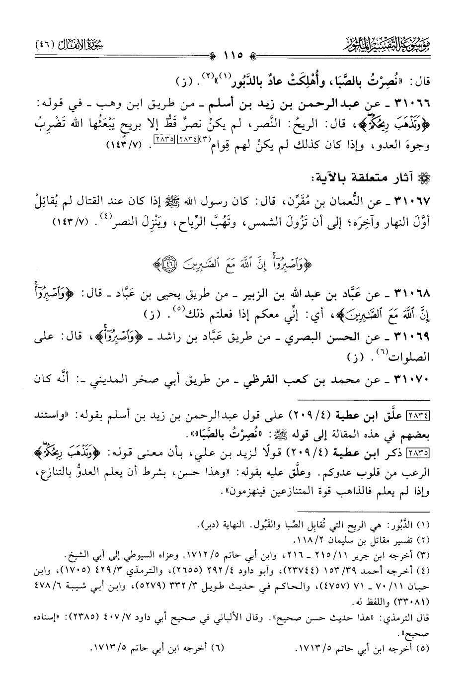 ٣١٠٦٦ - عن عبد الرحمن بن زيد بن أسلم -من طريق ابن وهب- في قوله: {وتذهب ريحكم}، قال: الريحُ: النَّصر، لم يكنْ نصرٌ قَطُّ إلا بريحٍ يَبْعَثُها الله تَضْرِبُ وجوهَ العدو، وإذا كان كذلك لم يكنْ لهم قِوام (¬٣) [٢٨٣٤] [٢٨٣٥]. (٧/ ١٤٣)