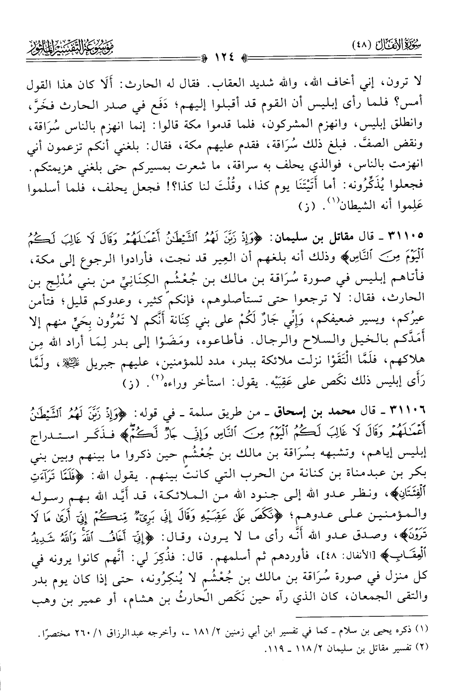 ٣١١٠٦ - قال محمد بن إسحاق -من طريق سلمة- في قوله: {وإذ زين لهم الشيطان أعمالهم وقال لا غالب لكم اليوم من الناس وإني جار لكم} فذَكَر استدراج إبليس إياهم، وتشبهه بسُراقة بن مالك بن جُعْشُمٍ حين ذكروا ما بينهم وبين بني بكر بن عبد مناة بن كنانة من الحرب التي كانت بينهم. يقول الله: {فلما تراءت الفئتان}، ونظر عدو الله إلى جنود الله من الملائكة، قد أيَّد الله بهم رسوله والمؤمنين على عدوهم؛ {نكص على عقبيه وقال إني بريء منكم إني أرى ما لا ترون}، وصدق عدو الله أنَّه رأى ما لا يرون، وقال: {إني أخاف الله والله شديد العقاب}، فأوردهم ثم أسلمهم. قال: فذُكِرَ لي: أنّهم كانوا يرونه في كل منزل في صورة سُراقة بن مالك بن جُعْشُمٍ لا يُنكِرُونه، حتى إذا كان يوم بدر والتقى الجمعان، كان الذي رآه حين نَكَص الحارثُ بن هشام، أو عمير بن وهب