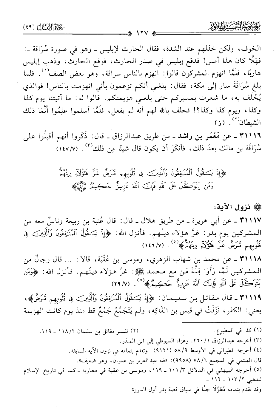 ٣١١١٨ - عن محمد بن شهاب الزهري، وموسى بن عُقْبَة، قالا: ... قال رجالٌ من المشركين لَمّا رَأَوْا قِلَّةَ مَن مع محمد - صلى الله عليه وسلم -: غرَّ هؤلاء دينُهم. فأنزل الله: {ومن يتوكل على الله فإن الله عزيز حكيم} (¬٥). (٧/ ٢٩)