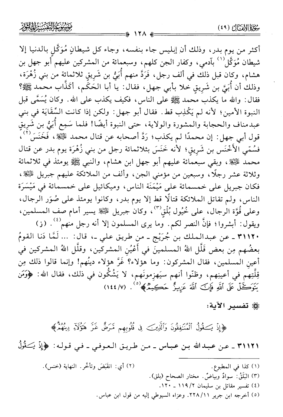 ٣١١٢٠ - عن عبد الملك بن جُرَيْج -من طريق علي-، قال: ... لَمّا دَنا القومُ بعضُهم مِن بعض قَلَّل اللهُ المسلمينَ في أعْيُنِ المشركين، وقلَّل اللهُ المشركين في أعينِ المسلمين، فقال المشركون: وما هؤلاء؟ غَرَّ هؤلاء دينُهم! وإنما قالوا ذلك مِن قِلَّتِهم في أعينِهم، وظنّوا أنهم سيَهزِمونَهم، لا يَشُكُّون في ذلك، فقال الله: {ومن يتوكل على الله فإن الله عزيز حكيم} (¬٥). (٧/ ١٤٤)