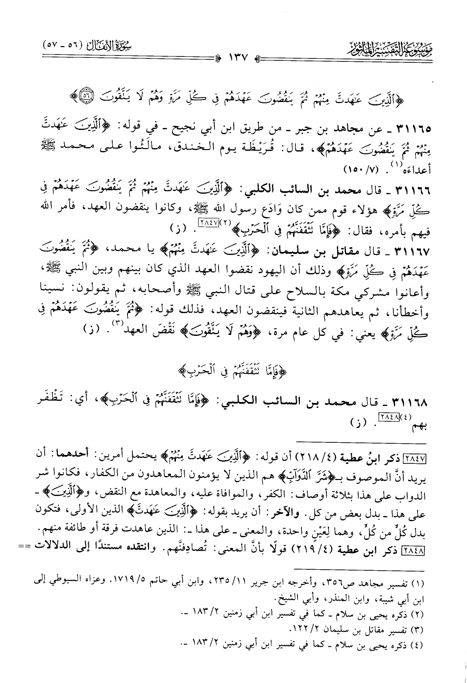 ٣١١٦٥ - عن مجاهد بن جبر -من طريق ابن أبي نجيح- في قوله: {الذين عاهدت منهم ثم ينقضون عهدهم}، قال: قُرَيْظَة يوم الخندق، مالَئُوا على محمد - صلى الله عليه وسلم - أعداءَه (¬١). (٧/ ١٥٠)