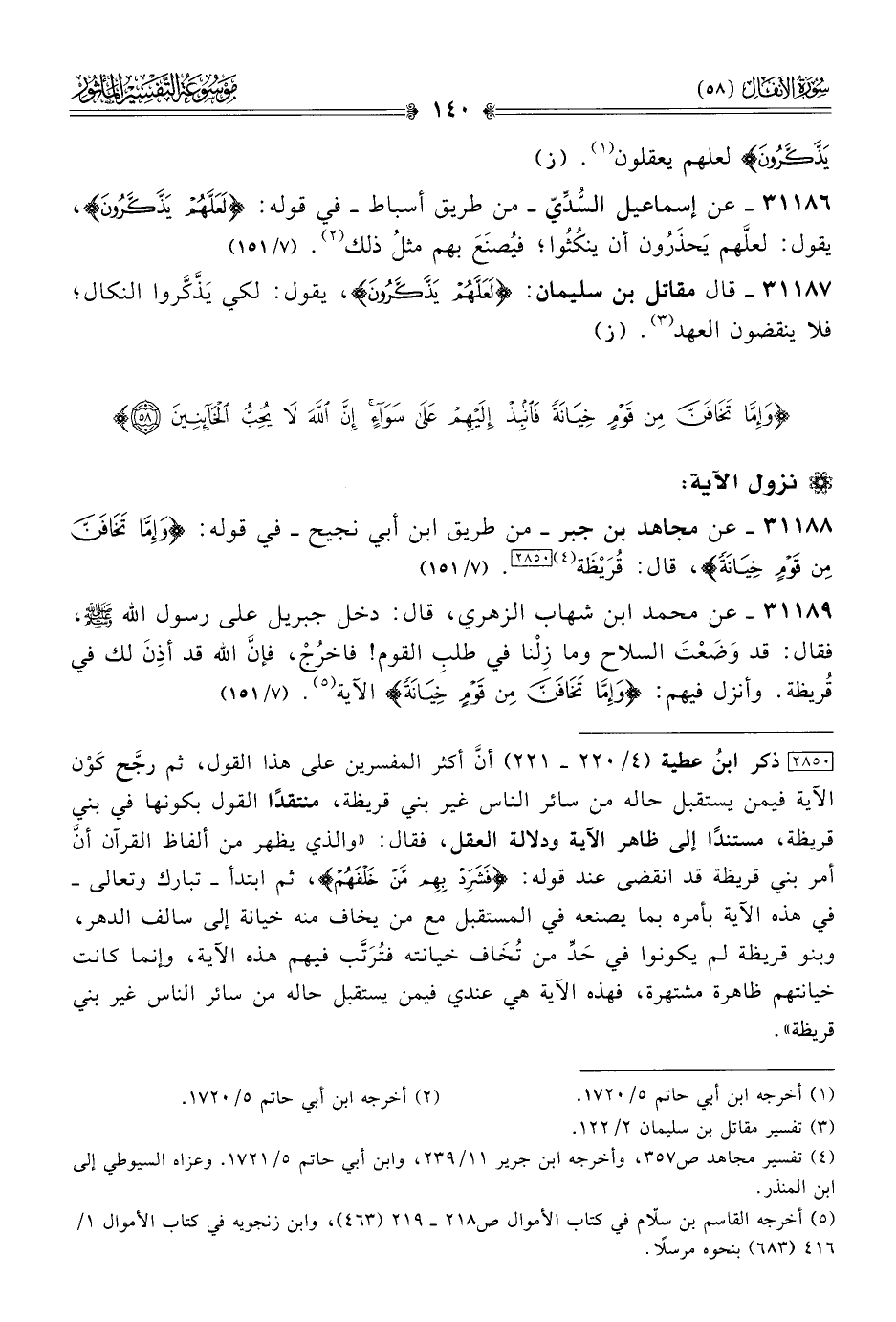 ٣١١٨٨ - عن مجاهد بن جبر -من طريق ابن أبي نجيح- في قوله: {وإما تخافن من قوم خيانة}، قال: قُرَيْظَة (¬٤) [٢٨٥٠]. (٧/ ١٥١)