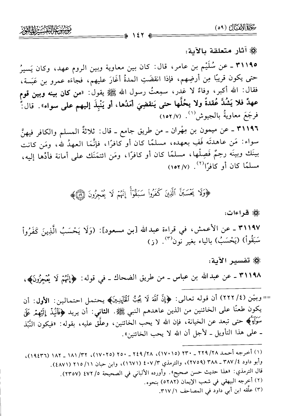 ٣١١٩٥ - عن سُلَيْم بن عامر، قال: كان بين معاوية وبين الروم عهد، وكان يَسيرُ حتى يكون قريبًا مِن أرضِهم، فإذا انقضَتِ المدةُ أغارَ عليهم، فجاءَه عمرو بن عَبَسة، فقال: الله أكبر، وفاءٌ لا غدر، سمِعتُ رسول الله - صلى الله عليه وسلم - يقول: «من كان بينه وبين قومٍ عهدٌ فلا يَشُدَّ عُقدةً ولا يحُلَّها حتى يَنقضِيَ أمَدُها، أو يَنْبِذَ إليهم على سواء». قال: فرجَعَ معاويةُ بالجيوش (¬١). (٧/ ١٥٢)