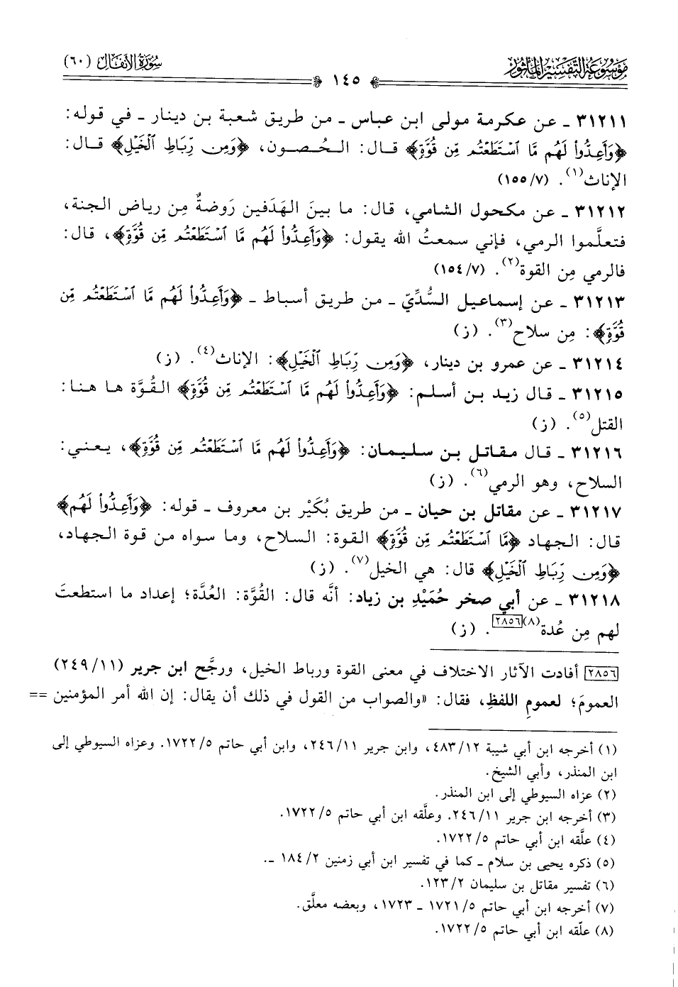 ٣١٢١٨ - عن أبي صخر حُمَيْدِ بن زياد أنّه قال: القُوَّة: العُدَّة؛ إعداد ما استطعتَ لهم مِن عُدة (¬٨) [٢٨٥٦]. (ز)
