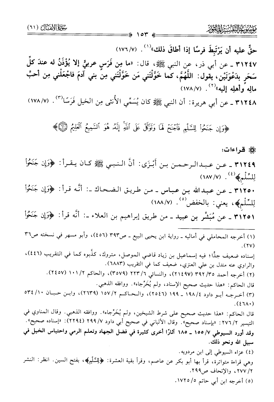 ٣١٢٤٩ - عن عبد الرحمن بن أبْزى، أنّ النبي - صلى الله عليه وسلم - كان يقرأ: «وإن جَنَحُواْ لِلسِّلْمِ» (¬٤). (٧/ ١٨٧)