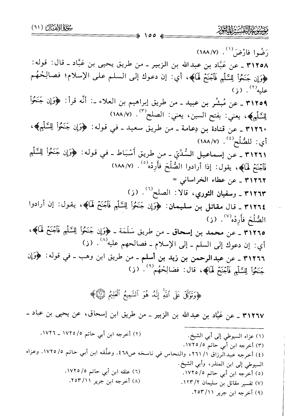 ٣١٢٥٨ - عن عَبّاد بن عبد الله بن الزبير -من طريق يحيى بن عَبّاد- قال: قوله: {وإن جنحوا للسلم فاجنح لها}، أي: إن دعوك إلى السلم على الإسلام؛ فصالِحْهُم عليه (¬٢). (ز)