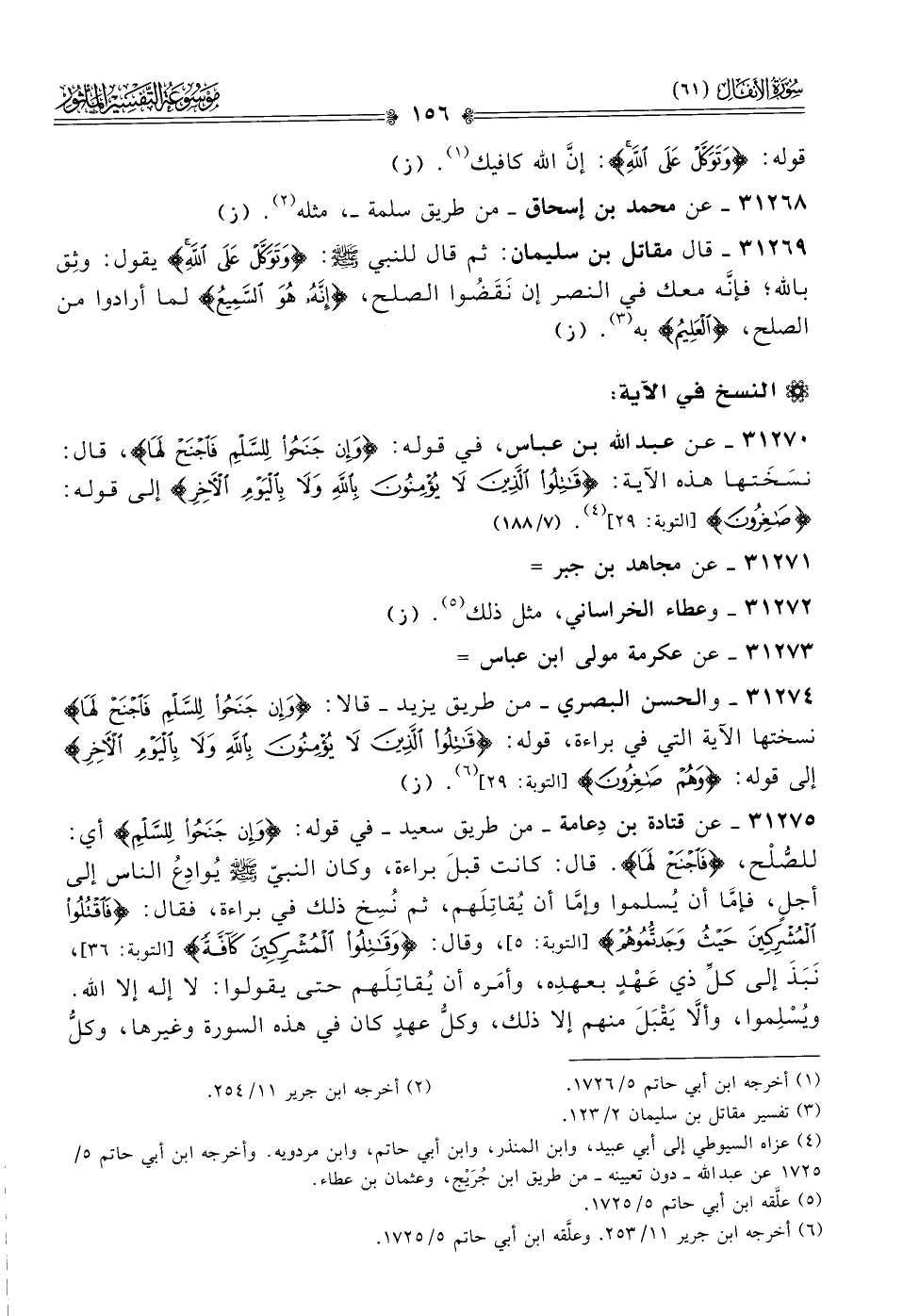 ٣١٢٧٤ - والحسن البصري -من طريق يزيد- قالا: {وإن جنحوا للسلم فاجنح لها} نسختها الآية التي في براءة، قوله: {قاتلوا الذين لا يؤمنون بالله ولا باليوم الآخر} إلى قوله: {وهم صاغرون} [التوبة: ٢٩] (¬٦). (ز)