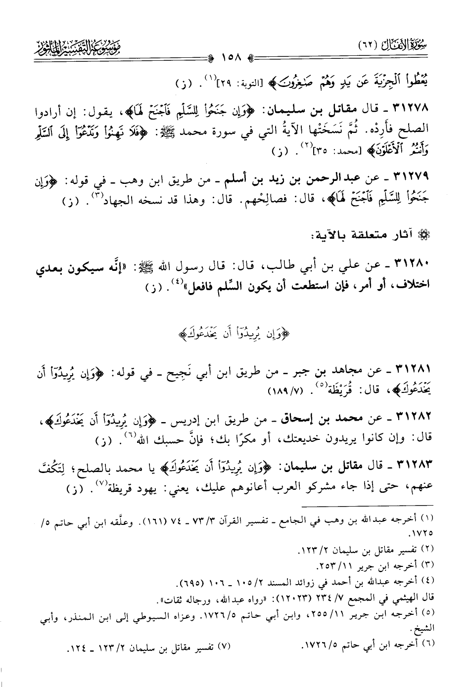 ٣١٢٧٩ - عن عبد الرحمن بن زيد بن أسلم -من طريق ابن وهب- في قوله: {وإن جنحوا للسلم فاجنح لها}، قال: فصالِحْهم. قال: وهذا قد نسخه الجهاد (¬٣). (ز)
