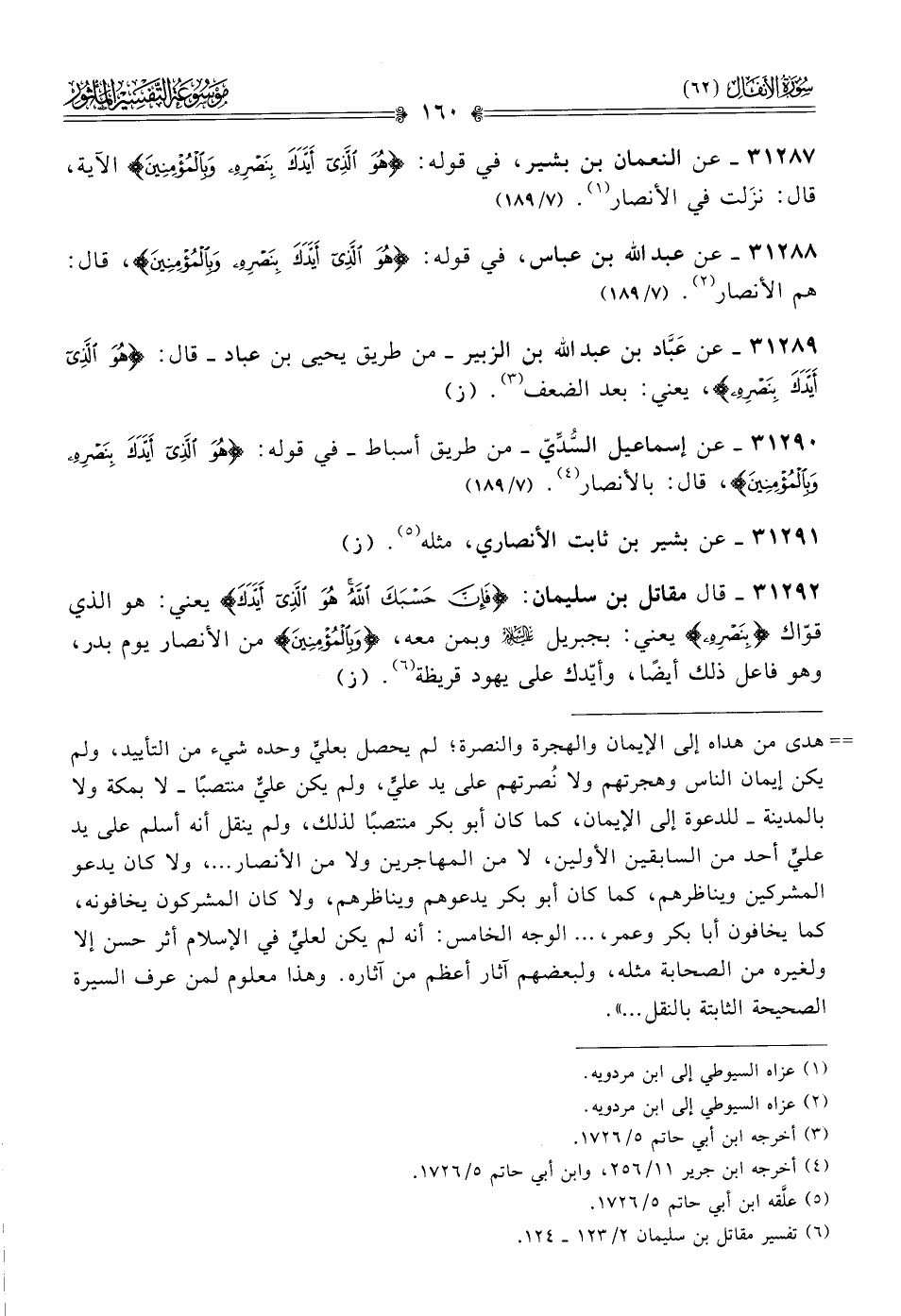 ٣١٢٩٠ - عن إسماعيل السُّدِّيّ -من طريق أسباط- في قوله: {هو الذي أيدك بنصره وبالمؤمنين}، قال: بالأنصار (¬٤). (٧/ ١٨٩)
